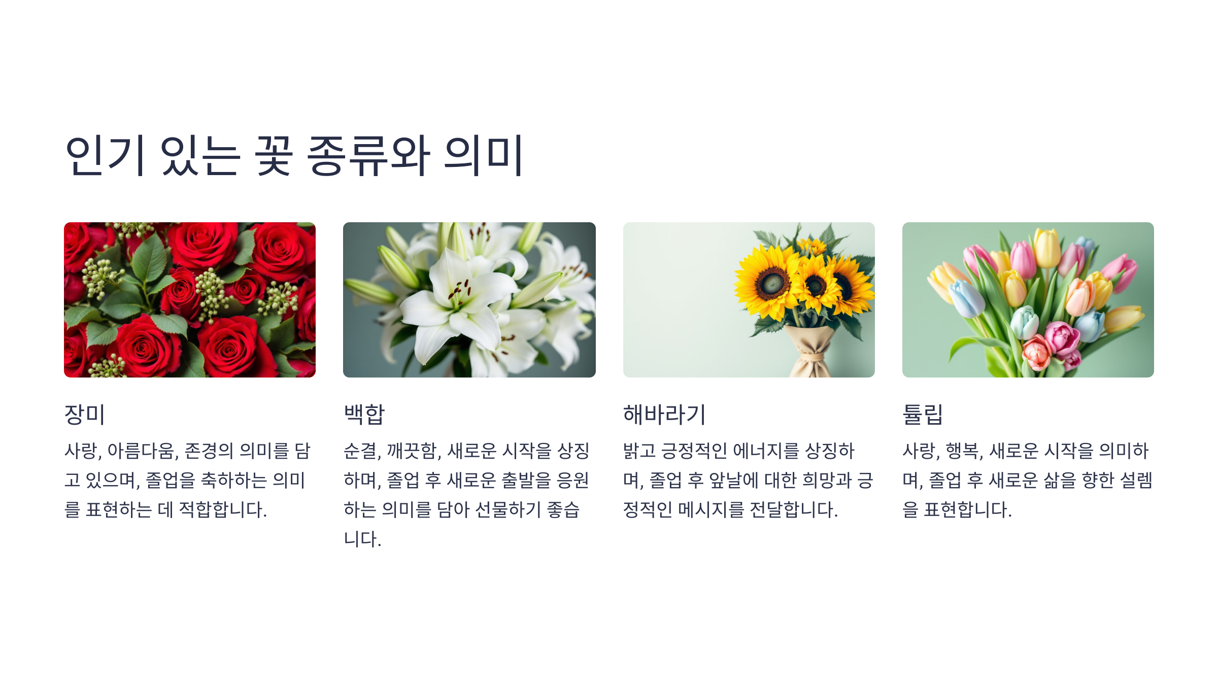 졸업식 꽃다발을 고를 때는 단순히 예쁜 것뿐만 아니라, 꽃이 가진 의미를 고려하면 더 의미 있는 선물이 될 수 있어요! 🎓💐
