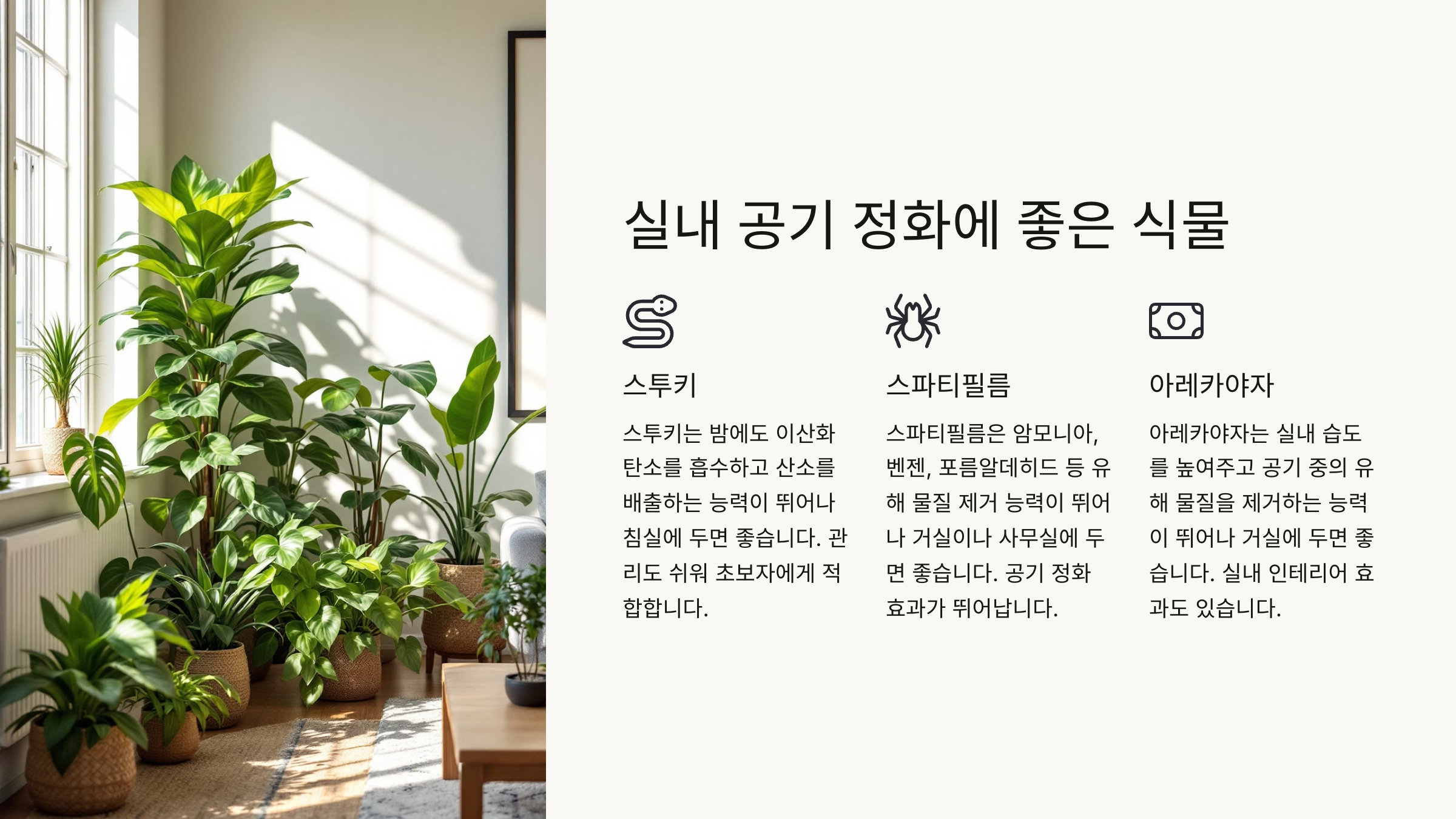 | 스파티필럼 | 유해 물질 제거, 습도 조절 | 거실, 침실 |