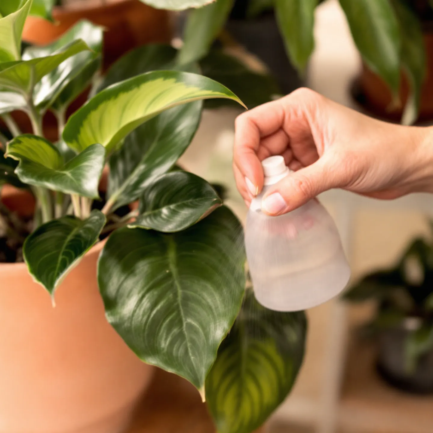 공기가 너무 건조하면 식물 잎도 쉽게 마를 수 있어요. 잎이 얇고 수분을 많이 필요로 하는 식물이라면, 하루 한 번 정도 분무기로 가볍게 물을 뿌려주는 것이 좋아요. 하지만 밤에는 분무하지 않는 것이 좋아요! 🌿