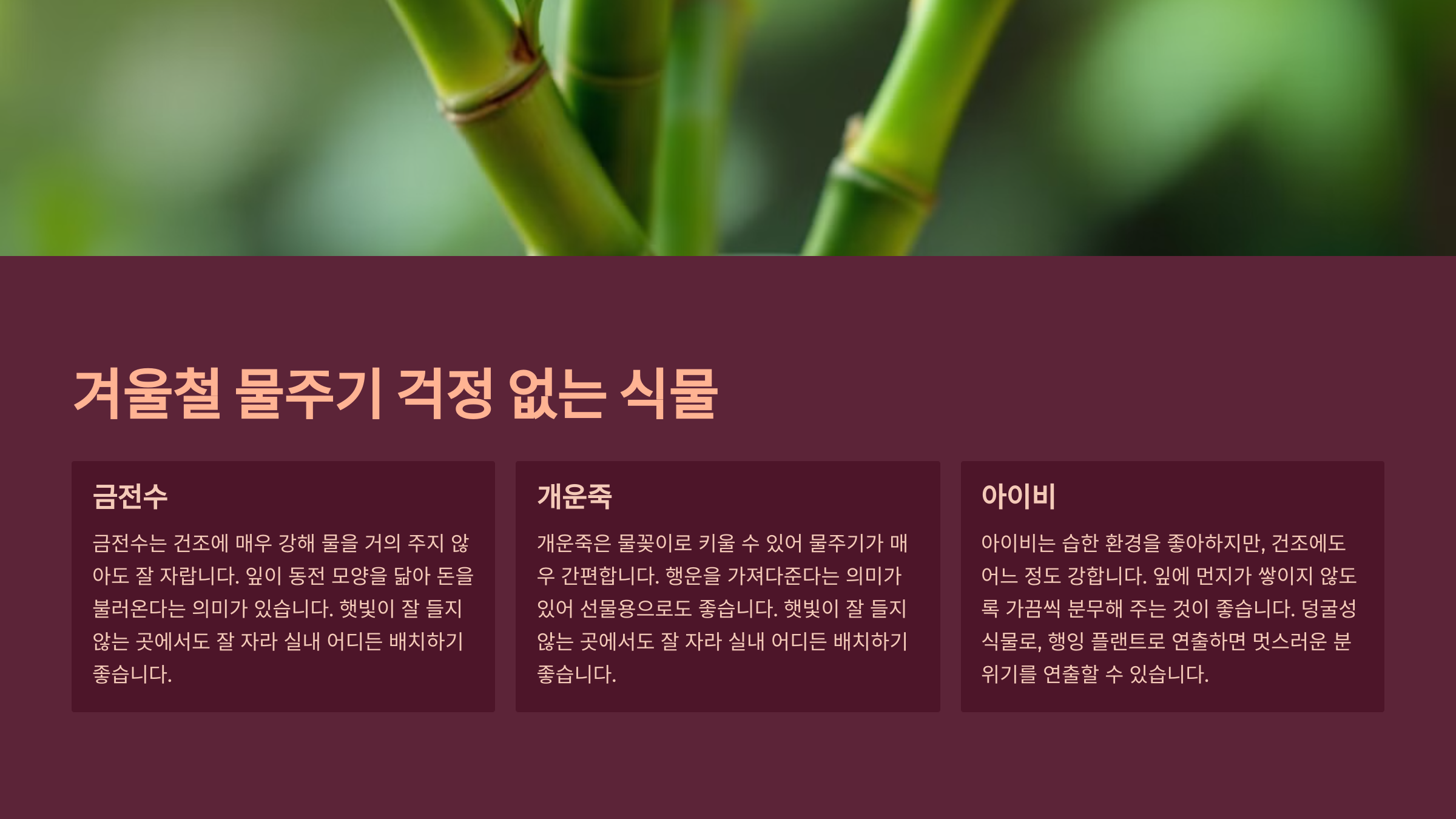 겨울철에는 식물의 성장 속도가 느려지면서 물을 적게 필요로 해요. 하지만 물을 너무 자주 주면 뿌리가 썩을 수 있기 때문에 물주기가 쉬운 식물을 선택하는 것이 중요해요. 아래 식물들은 겨울철에도 물을 적게 주면서 키울 수 있는 대표적인 식물들이에요.
