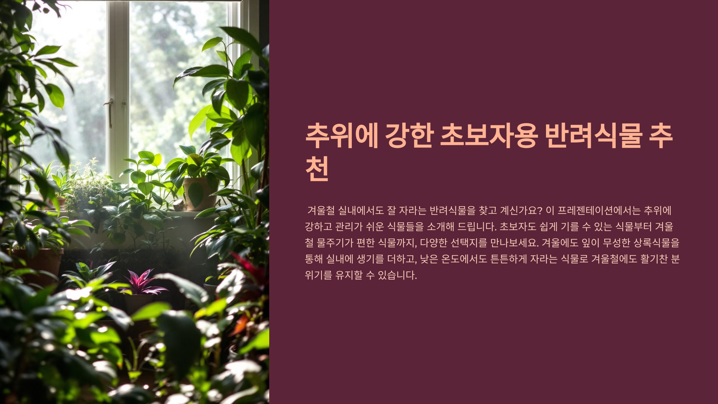 이번 글에서는 추위에 강하고 물주기가 쉬운 식물, 낮은 온도에서도 생명력이 강한 식물, 겨울철 실내 적응력이 높은 식물들을 소개할게요. 또한 겨울철 반려식물 추천 리스트도 포함했으니 참고해 보세요. 실내에서 따뜻하고 싱그러운 분위기를 유지하고 싶다면 지금부터 함께 알아봐요! 🌿❄️
