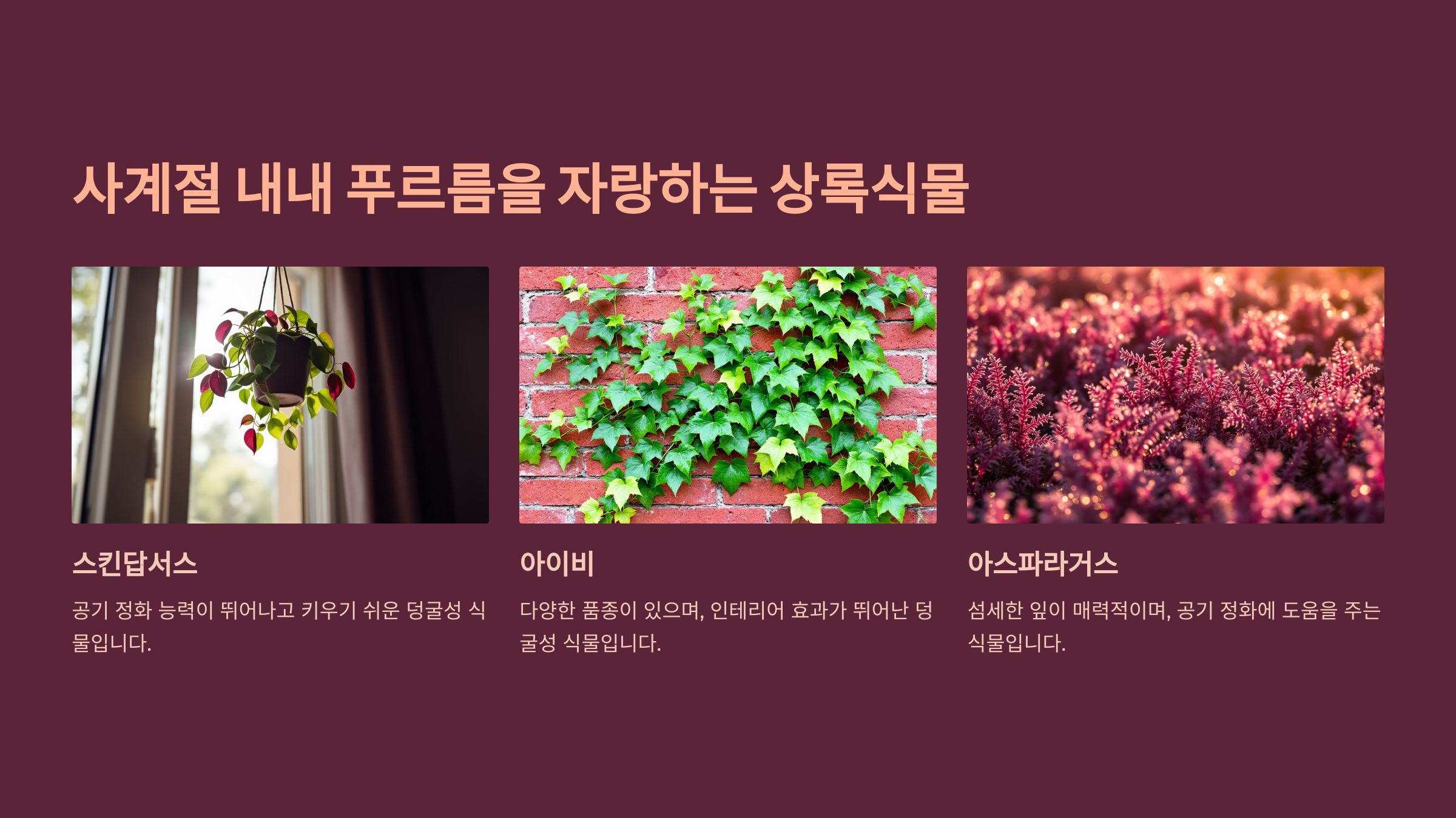 3️⃣ **아이비 (헤데라 헬릭스)**: 겨울철에도 잎이 무성하고 생명력이 강한 덩굴 식물이에요. 공기 정화 능력이 뛰어나 실내에서 키우기 좋아요.