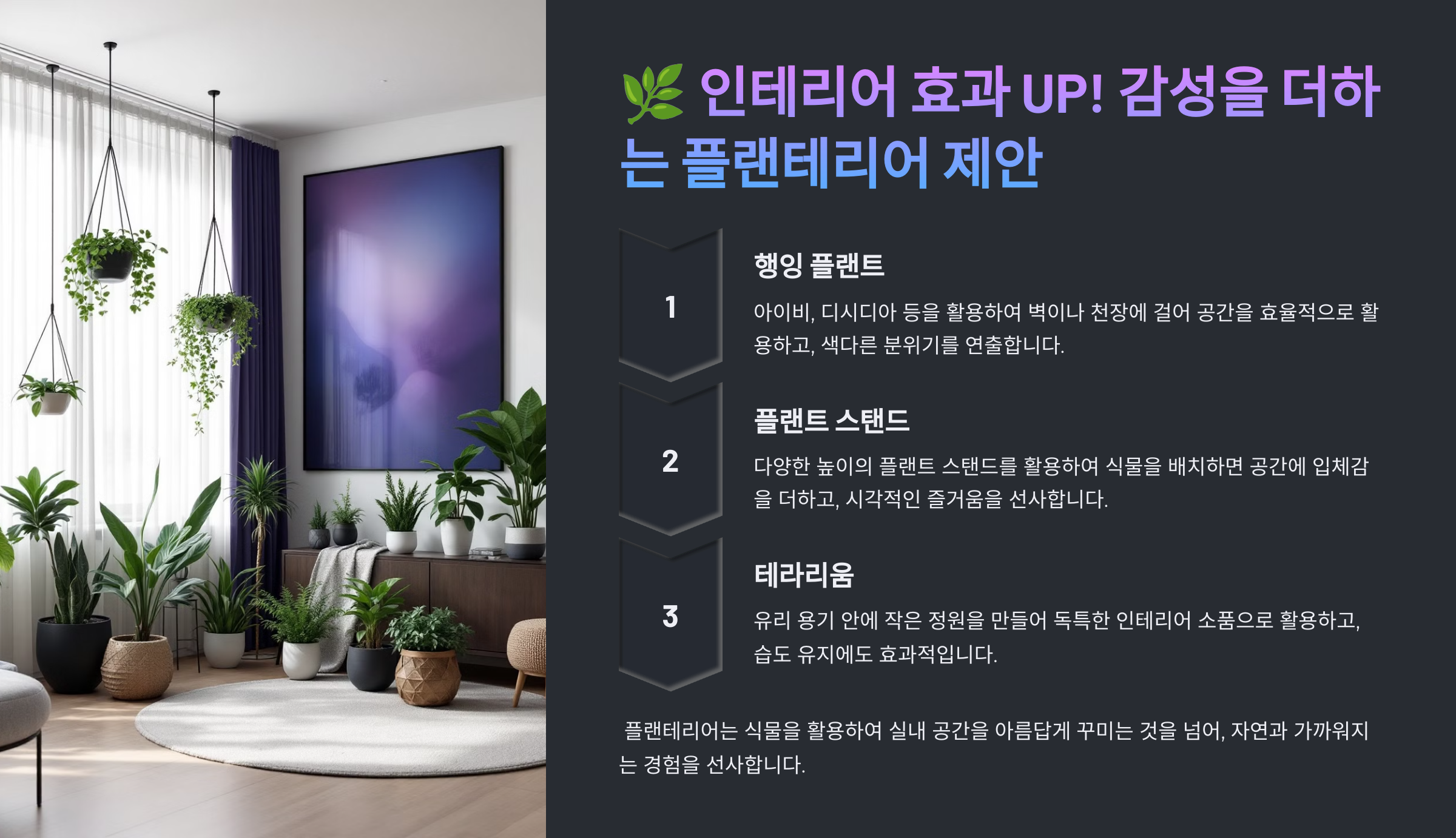 | 식물명 | 특징 | 인테리어 효과 |