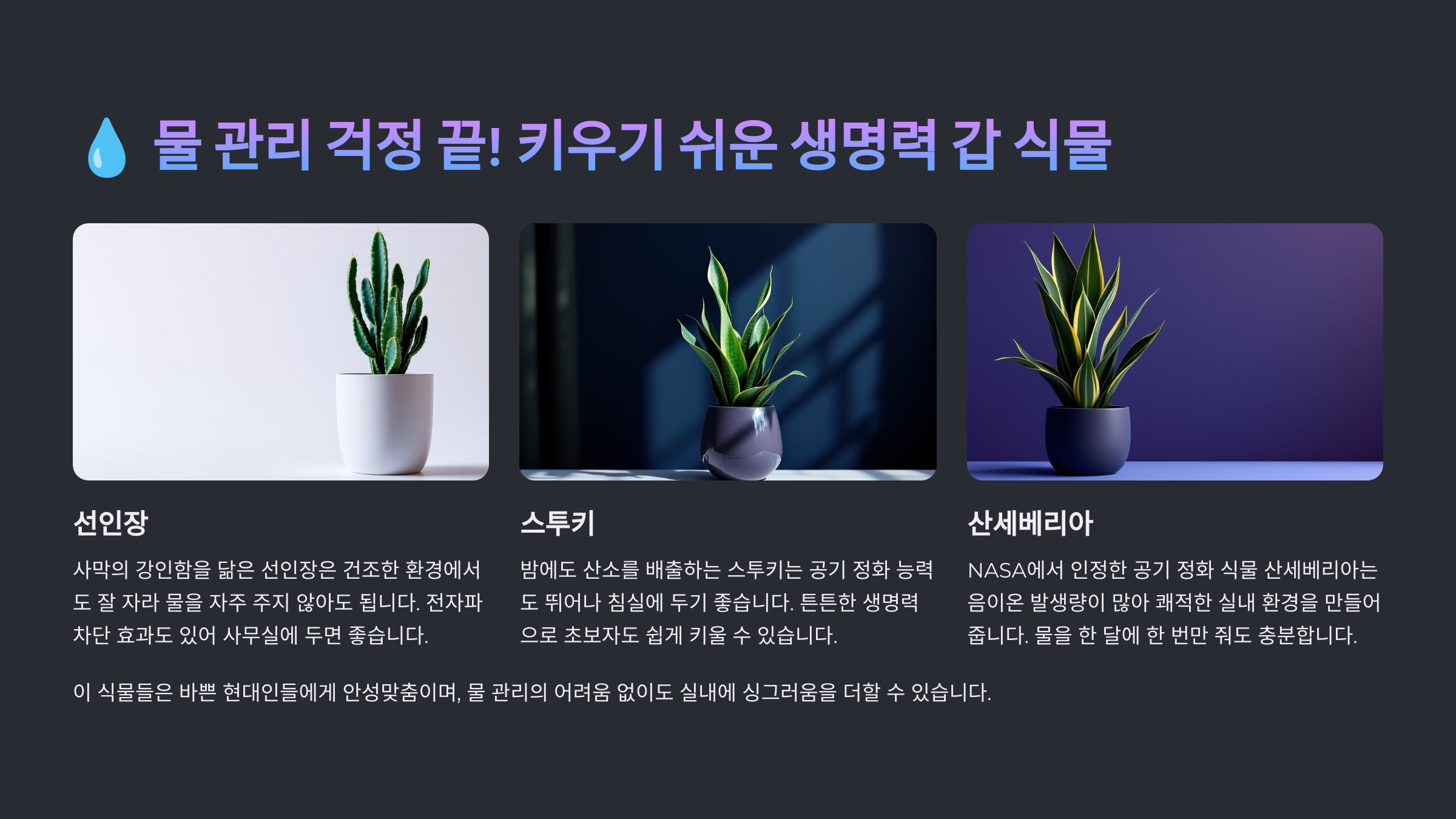 | 산세베리아 | 공기 정화, 건조에 강함 | 한 달에 1~2회 |