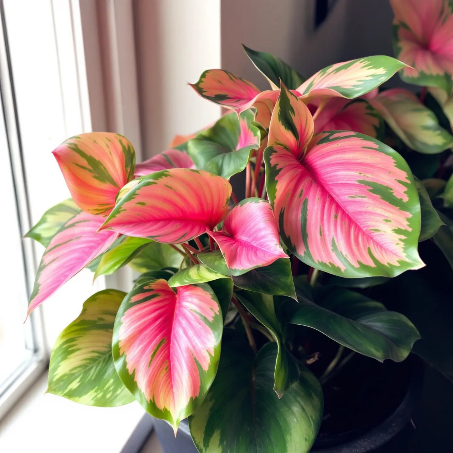 잎이 녹색과 핑크색으로 섞여 있어 희귀한 식물 중 하나예요. 직사광선을 피하고, 높은 습도를 유지해 주어야 해요. 💖