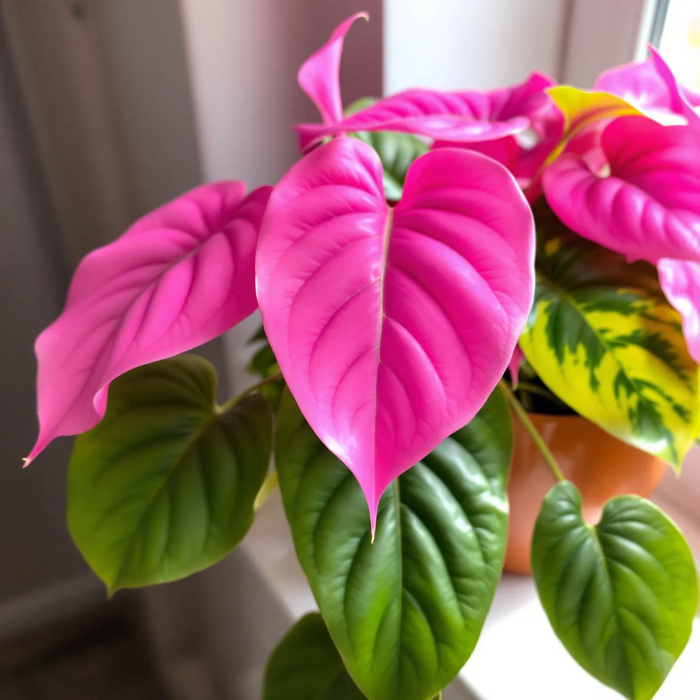 잎이 녹색과 핑크색으로 섞여 있어 희귀한 식물 중 하나예요. 직사광선을 피하고, 높은 습도를 유지해 주어야 해요. 💖