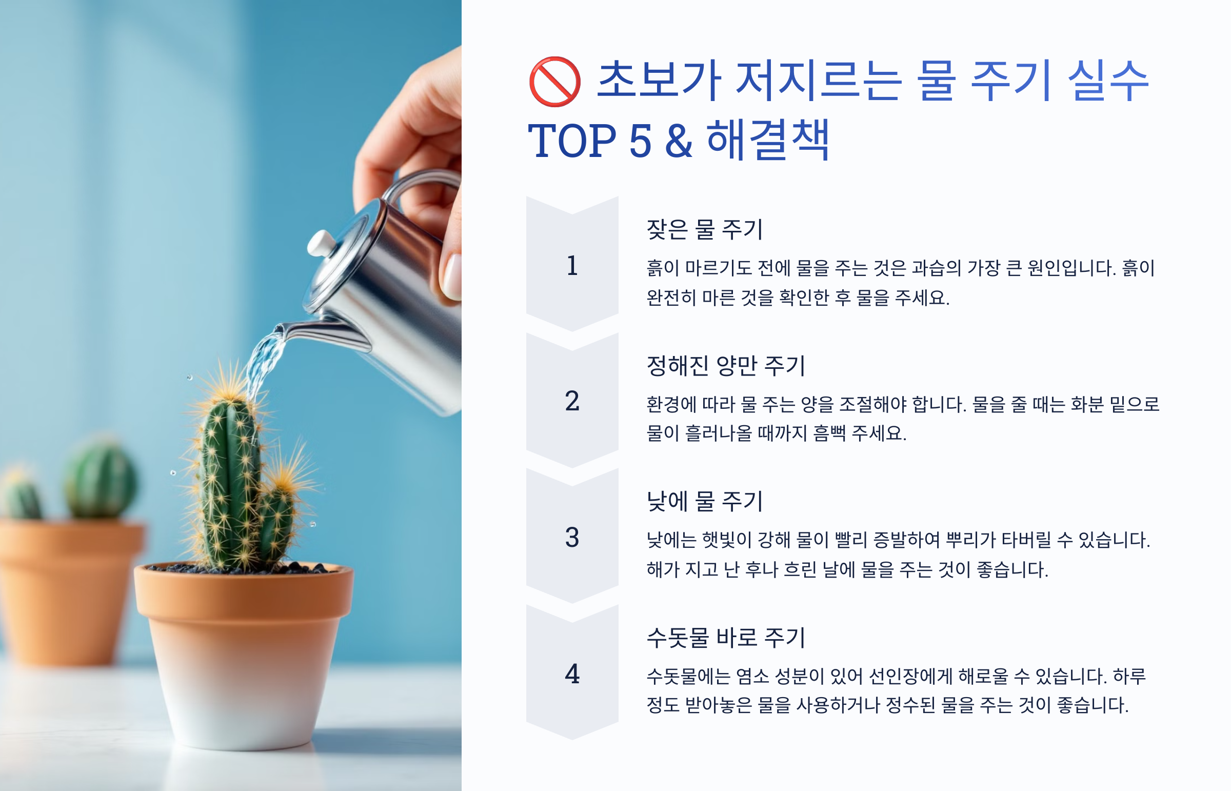 많은 사람들이 물을 너무 자주 주거나, 반대로 너무 오랫동안 주지 않아서 선인장을 죽이는 실수를 해요. **물 주는 타이밍이 선인장의 생존을 좌우합니다.** 🌵