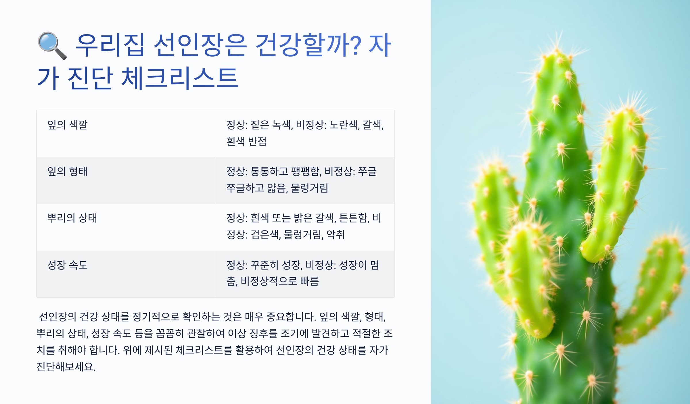 선인장이 건강하게 자라고 있는지 어떻게 알 수 있을까요? **색, 잎 상태, 성장 속도** 등을 체크하면 선인장의 상태를 쉽게 확인할 수 있어요! 🌿
