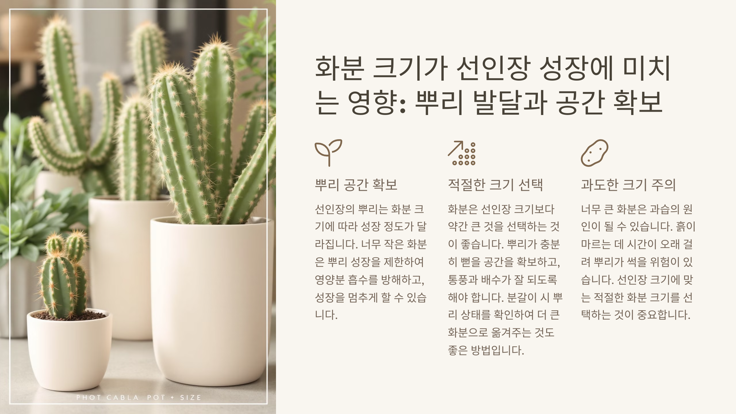 ✅ 결론적으로, 선인장의 크기에 맞는 화분을 선택해야 건강하게 성장할 수 있어요. 너무 크거나 작은 화분은 오히려 성장을 방해할 수 있기 때문에 적절한 크기를 선택하는 것이 중요하답니다! 🌱