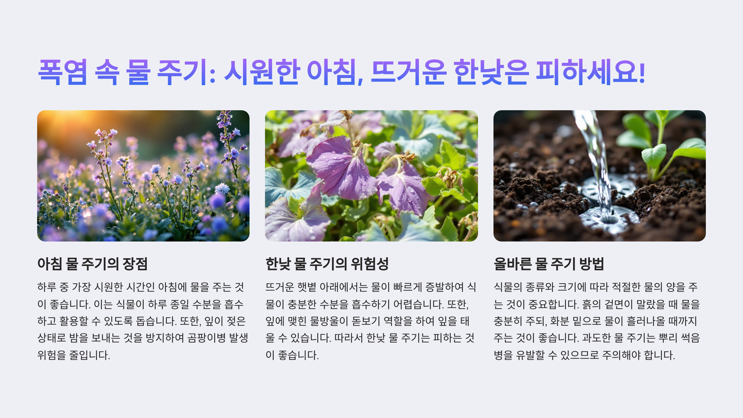 - 🚫 낮에는 물 주지 않기! (급격한 온도 변화로 뿌리가 손상될 수 있어요.)