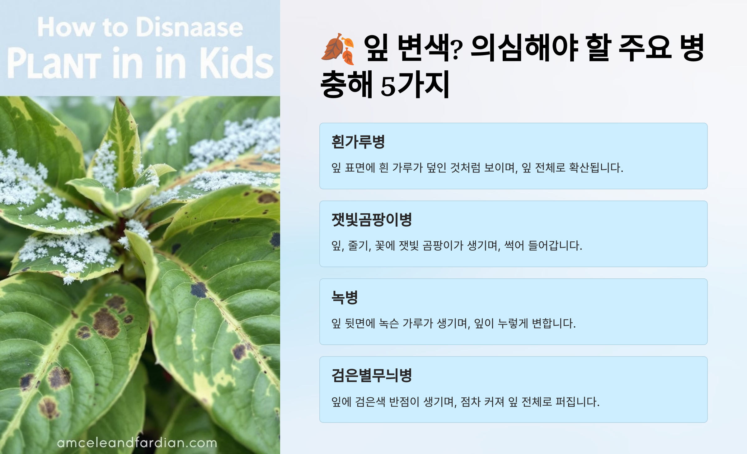 | 증상 | 원인 | 주요 병해 | 예방 및 대처법 |