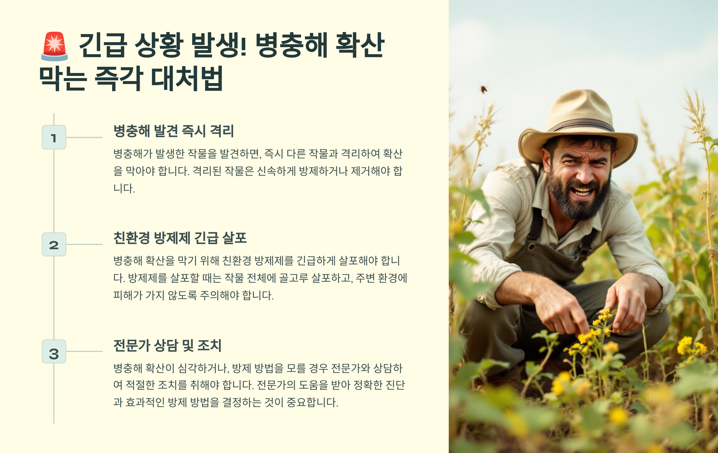 병충해가 발생했을 때 빠르게 대처하는 것이 피해를 최소화하는 방법이에요. 확산을 막기 위해 즉시 조치해야 해요! 🚨