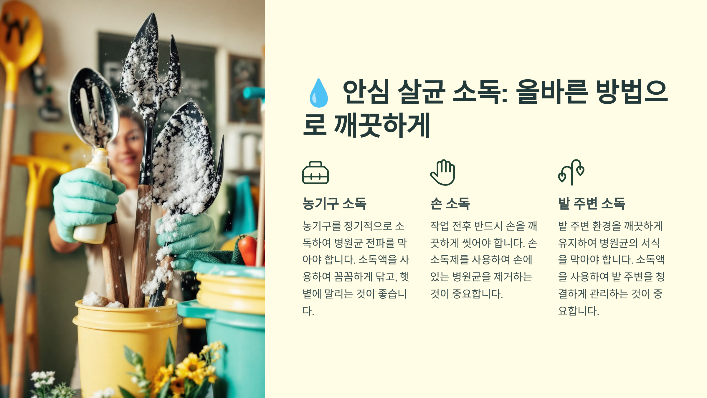 병충해 예방을 위해서는 정기적인 살균과 소독이 필수예요. 하지만 무조건 소독제를 뿌리는 것이 아니라, 올바른 방법을 사용해야 효과가 있답니다! 🧐