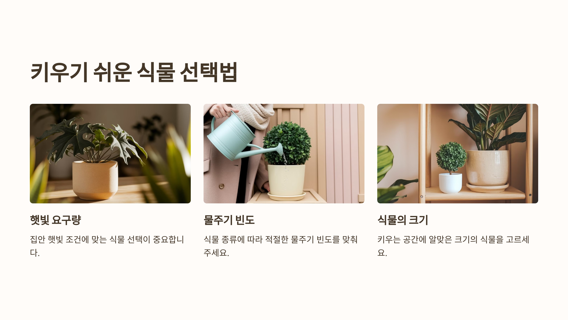 식물을 처음 선택할 때 몇 가지 중요한 기준을 고려하면 실수를 크게 줄일 수 있습니다. 올바른 식물을 선택하면 관리 부담이 줄고 식물이 오래 건강하게 자랍니다.