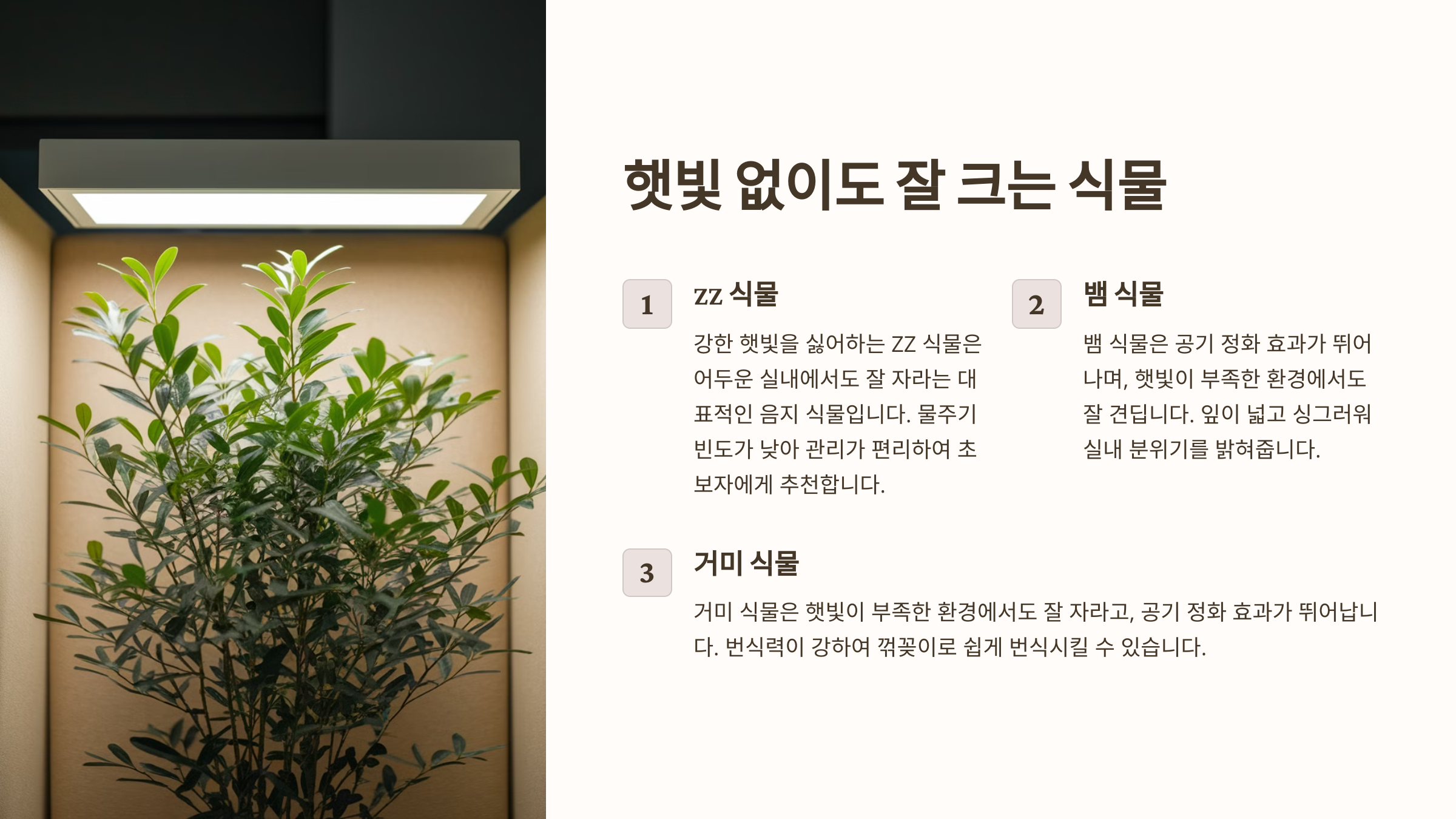햇빛이 잘 들지 않는 공간에서도 잘 자라는 식물들이 있습니다. 이런 식물들은 저조도 환경에서도 생존할 수 있어 실내 인테리어나 사무실에 매우 적합합니다.