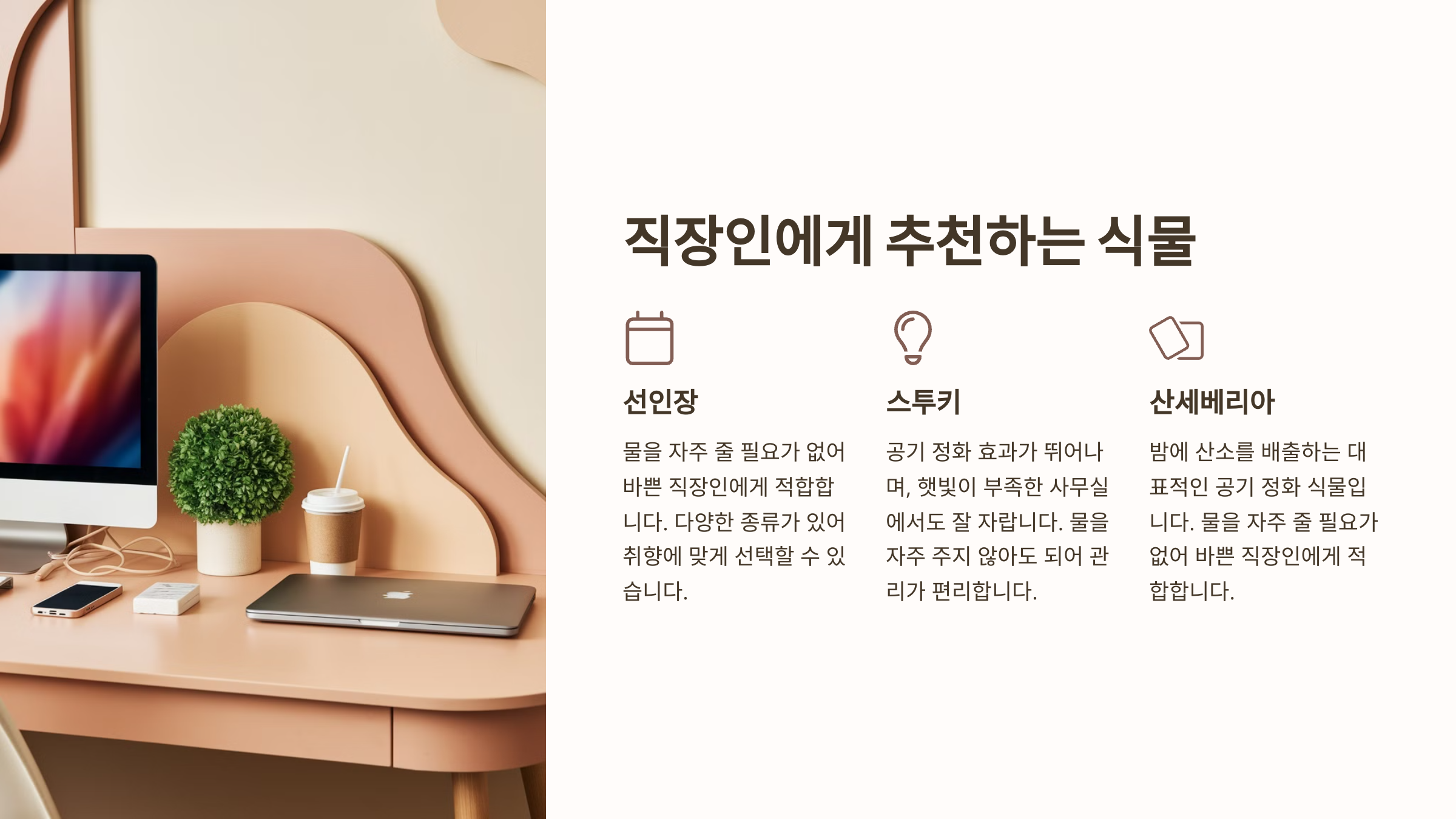 - 사무실 책상: 미니 선인장, 테라리움, 에어플랜트 – 작은 공간에 두기 좋으며 관리 부담이 적습니다.