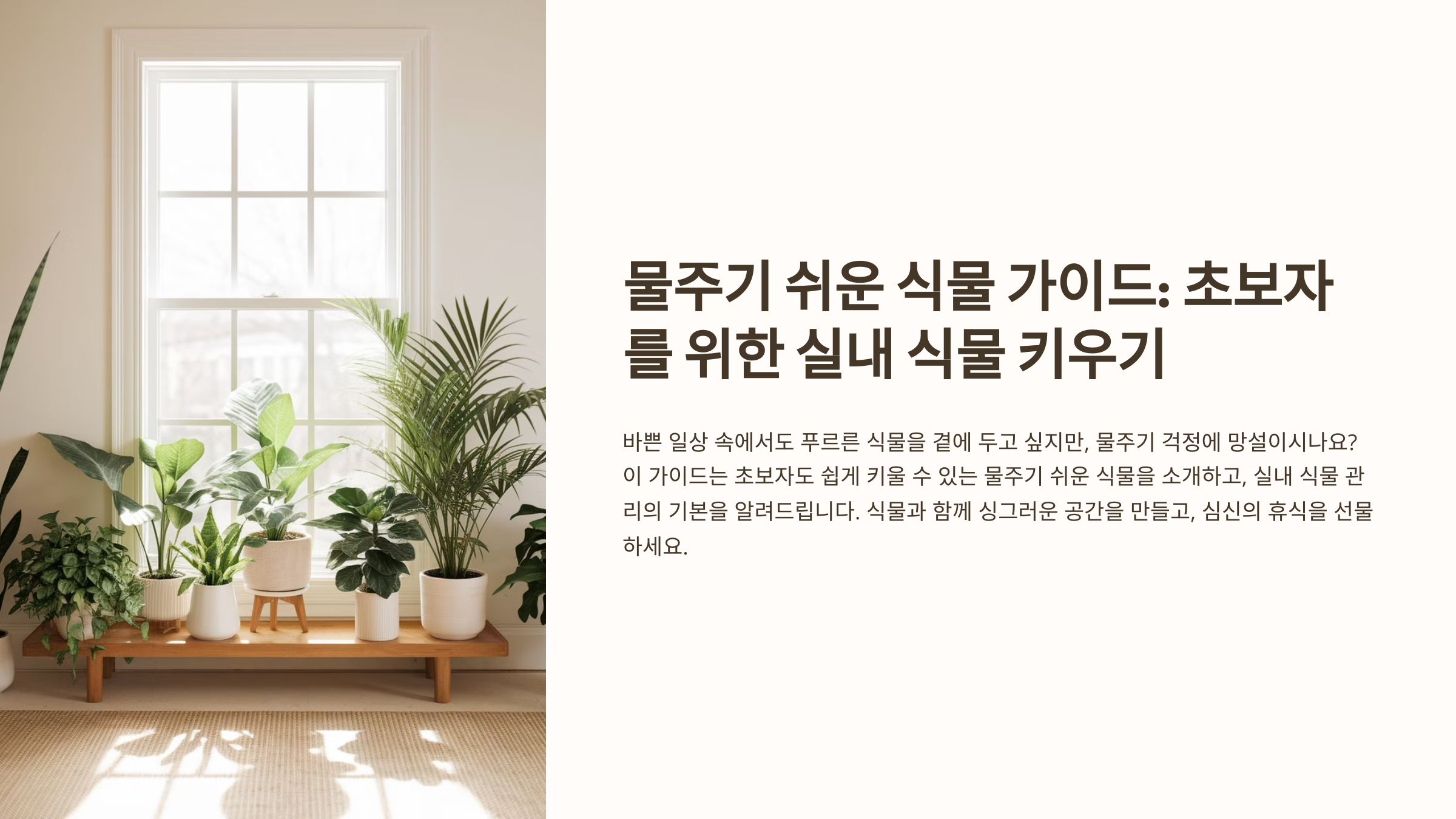 - 관리 난이도: 물과 햇빛 요구량이 적은 식물을 선택하면 초보자도 부담 없이 키울 수 있습니다. 물을 자주 주지 않아도 되는 식물이 특히 추천됩니다.