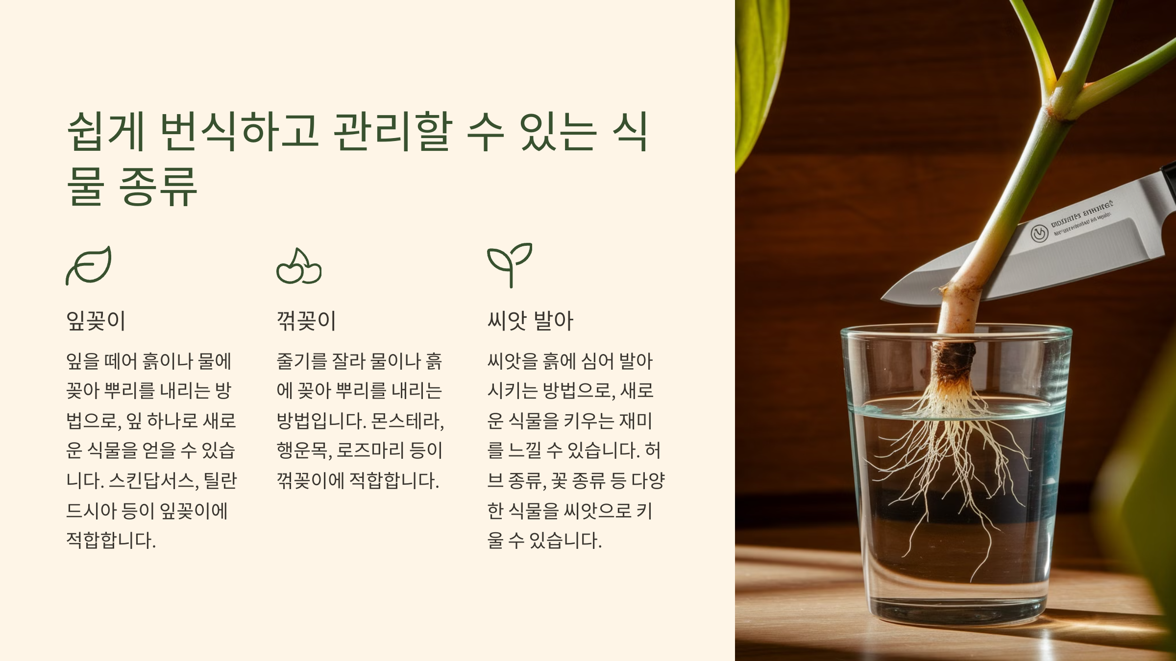 | 번식 용이성 | 잎꽂이나 물꽂이로 쉽게 번식 가능 | 아이비, 필로덴드론 🍃 |