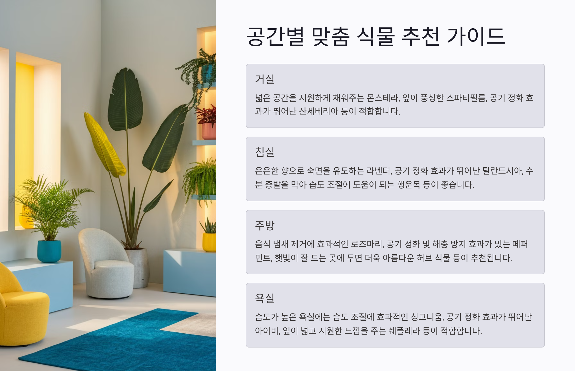 | 욕실 | 보스턴 고사리, 틸란드시아 | 습기 흡수, 자연 가습 | 쾌적하고 상쾌한 공간 |