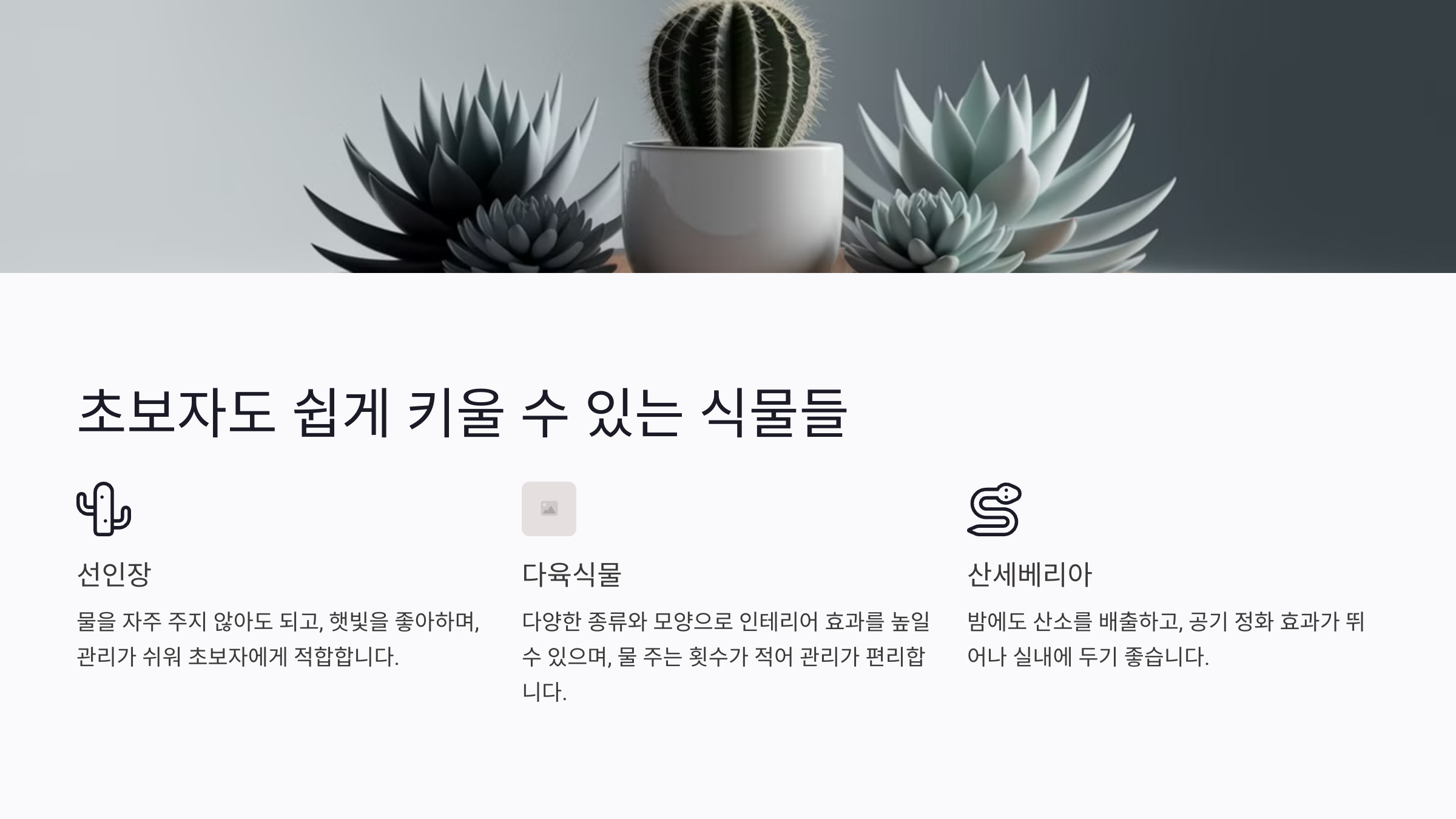 | 다육식물 | 적은 물로도 생존, 다양한 종류 | 매우 쉬움 🌟 | 책상, 작은 공간 |