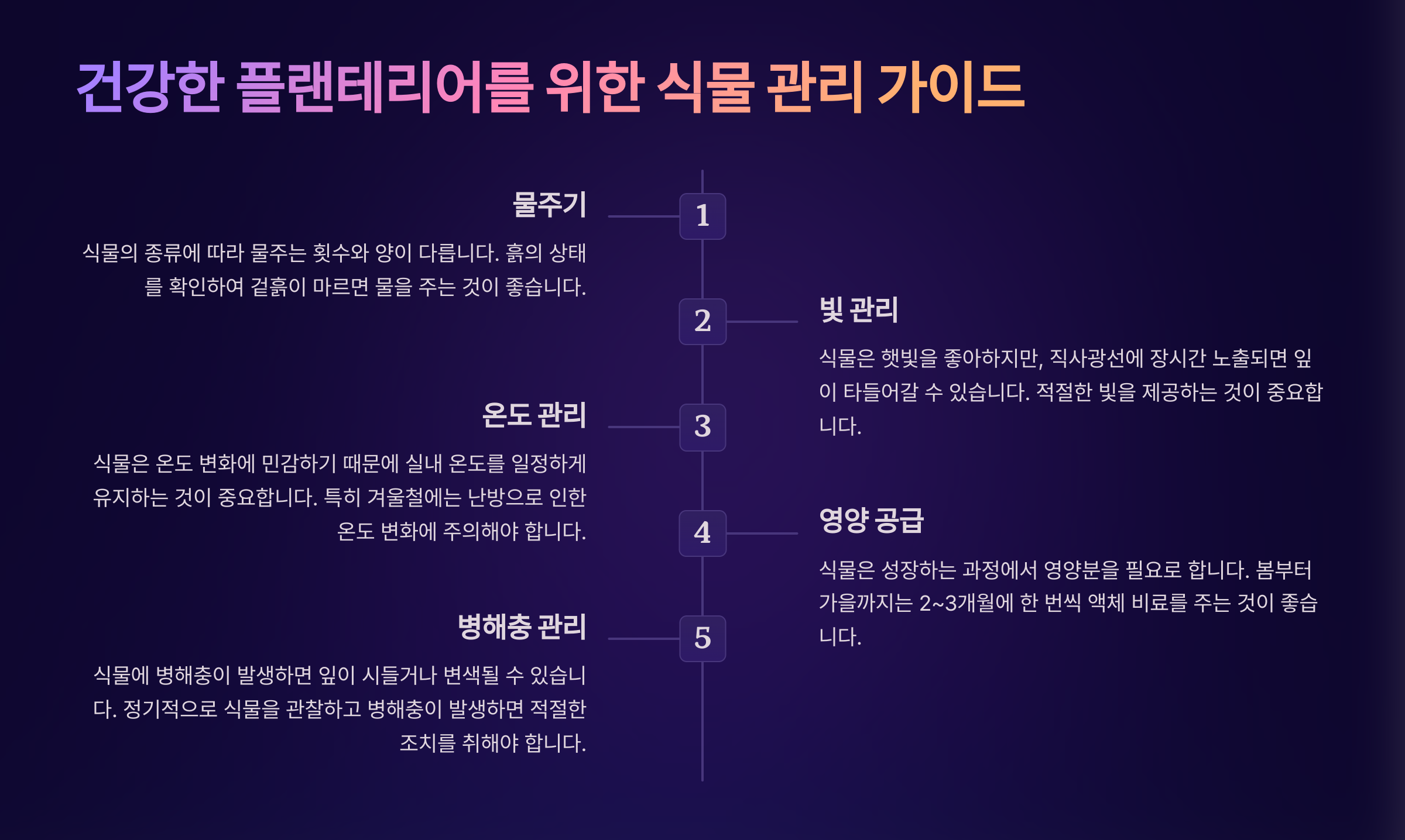 | 빛 관리 | 밝은 간접광 제공 & 화분 주기적 회전 | 균형 잡힌 성장 & 건강한 잎 🌤️🍃 |
