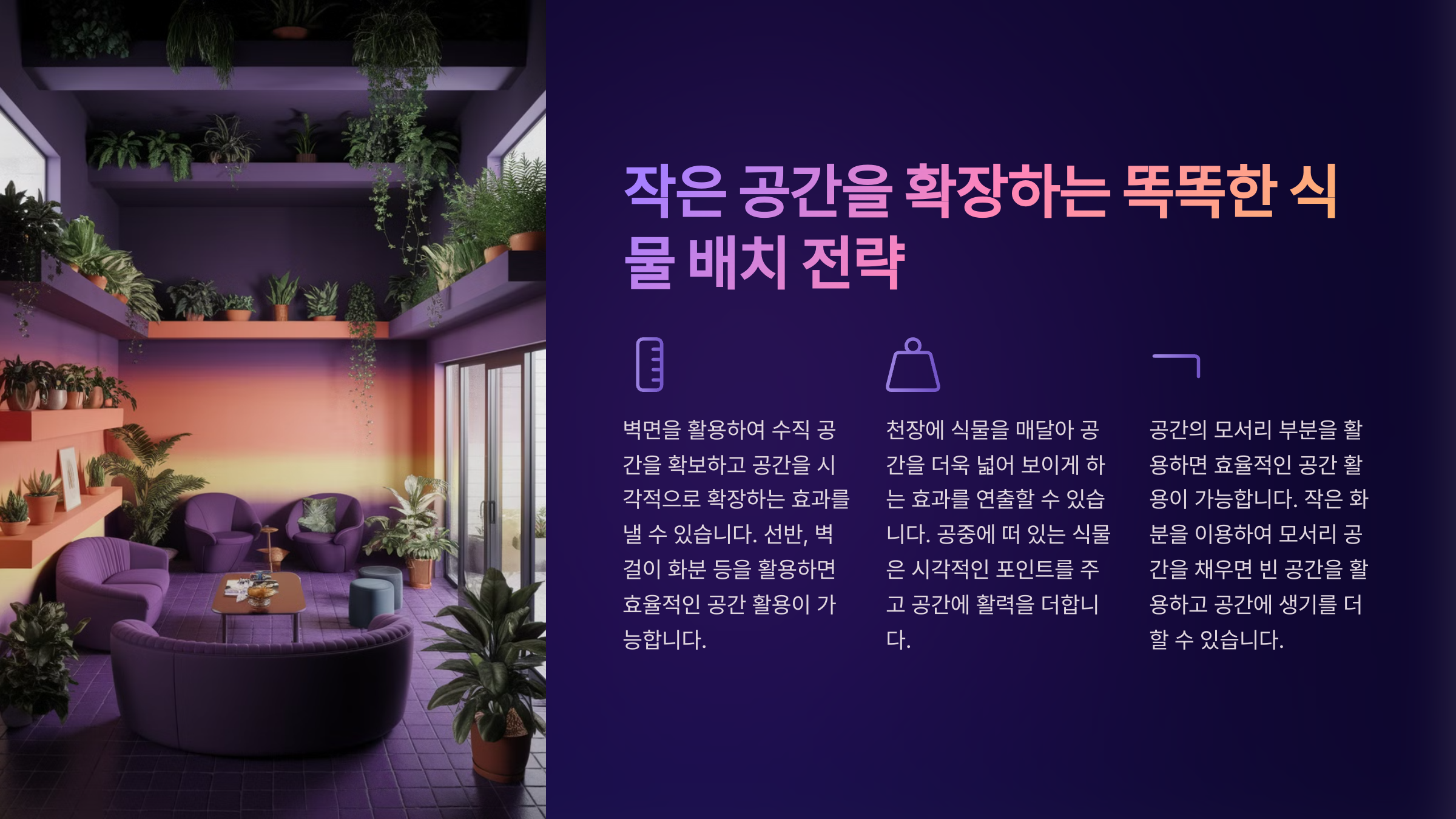 | 벽면 활용 | 벽걸이 화분, 선반 설치 | 아이비, 틸란드시아 | 공간 절약 & 세련된 인테리어 🌿🖼️ |