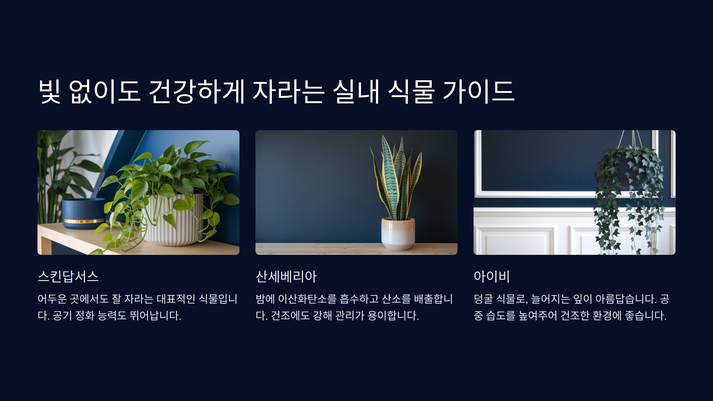 - 🍃 스킨답서스: 빛이 거의 없는 곳에서도 잘 자라는 덩굴식물이에요. 선반이나 책상 위에 두면 포인트가 돼요.