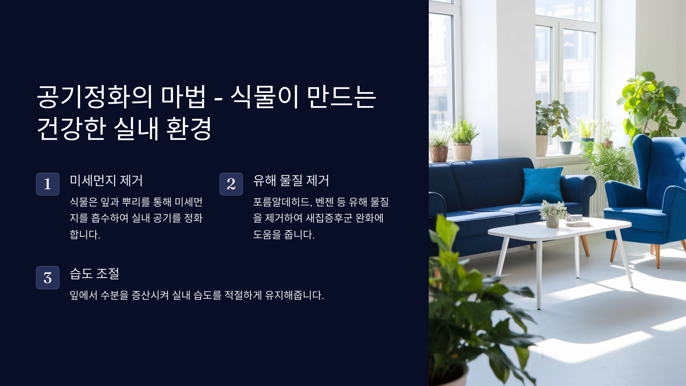 - 💧 욕실과 주방에도 식물 배치: 습기 제거와 냄새 제거에 탁월해요.