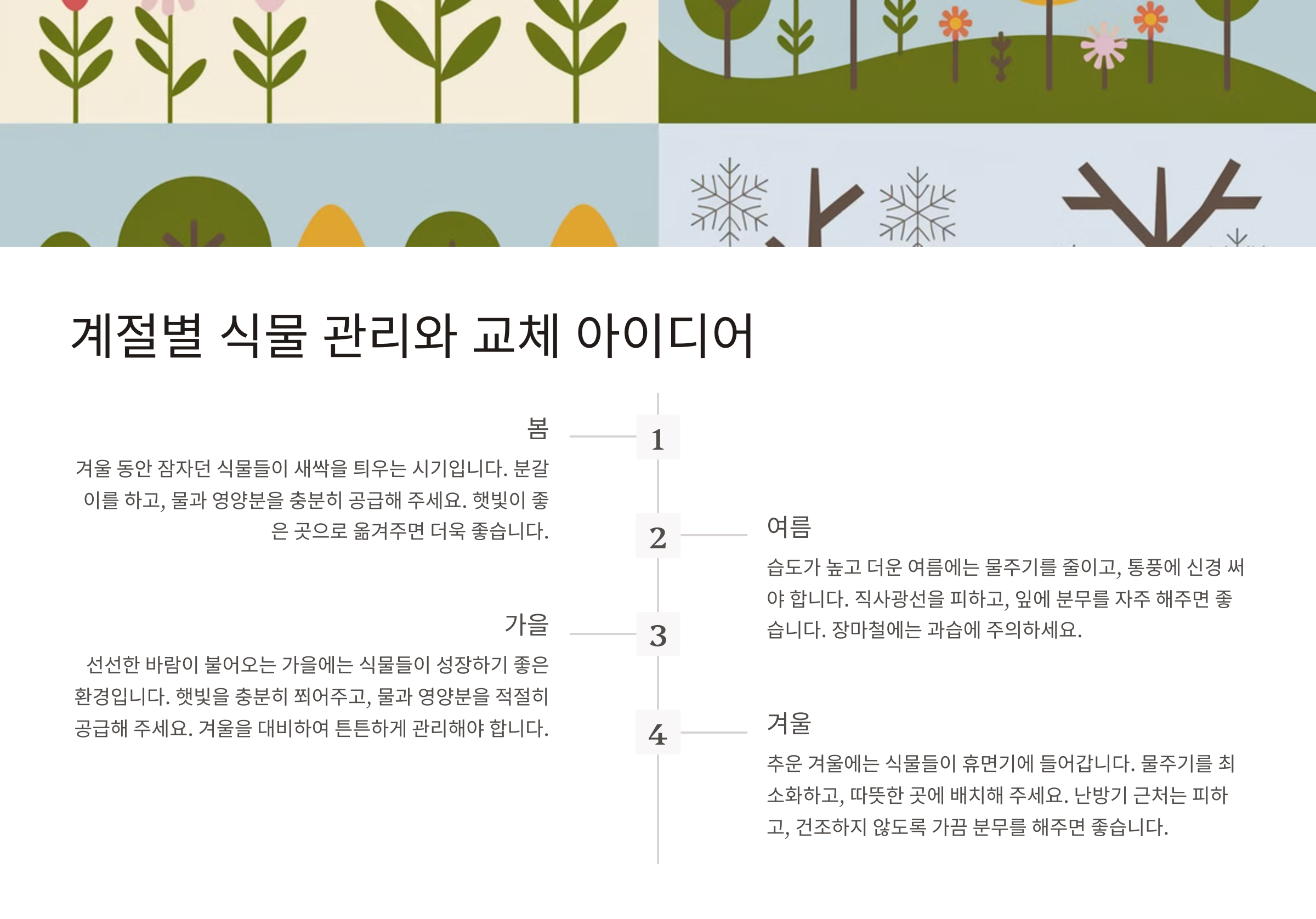 계절마다 플랜테리어에 변화를 주면 **더 감각적인 공간 연출이 가능해요!** 🌸🌿🍂❄️