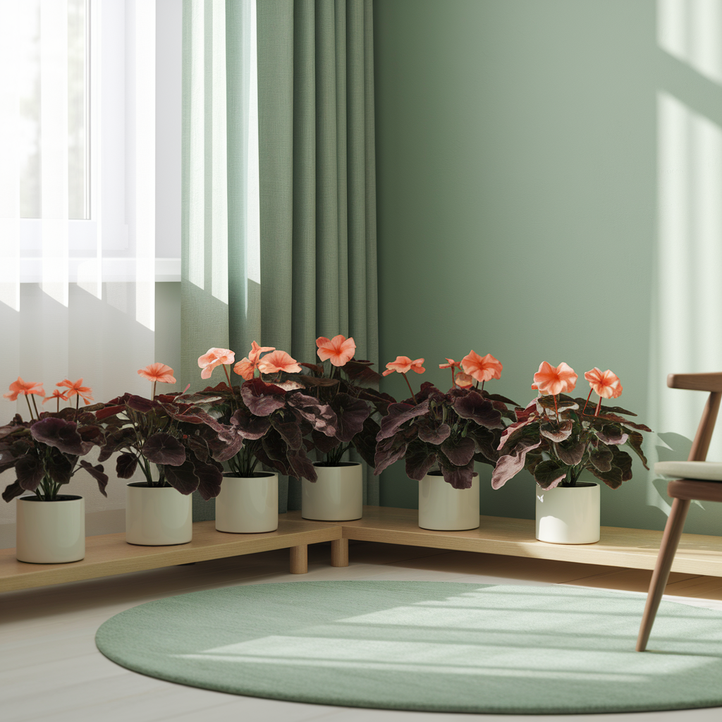 베고니아는 밝은 간접광을 좋아하지만, 직사광선을 받으면 잎이 타버릴 수 있어요. 창가 커튼 뒤쪽이나 반그늘에서 키우는 게 좋아요.