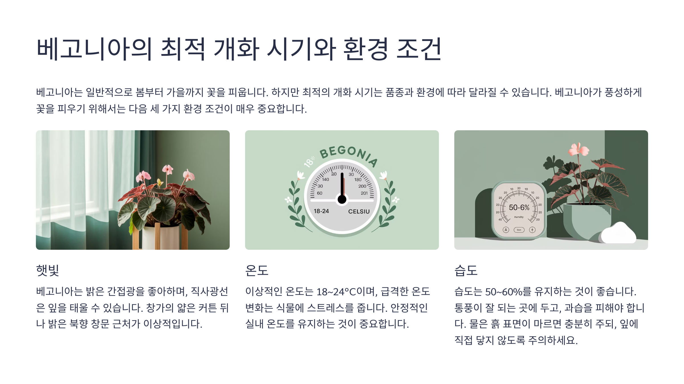 내가 생각했을 때, 베고니아를 잘 키우려면 온도와 습도 관리가 가장 중요해요. 빛이 너무 강하면 잎이 타고, 너무 어두우면 꽃이 안 피더라고요. 물도 너무 자주 주면 뿌리가 썩을 수 있으니 주의해야 해요! 🌿