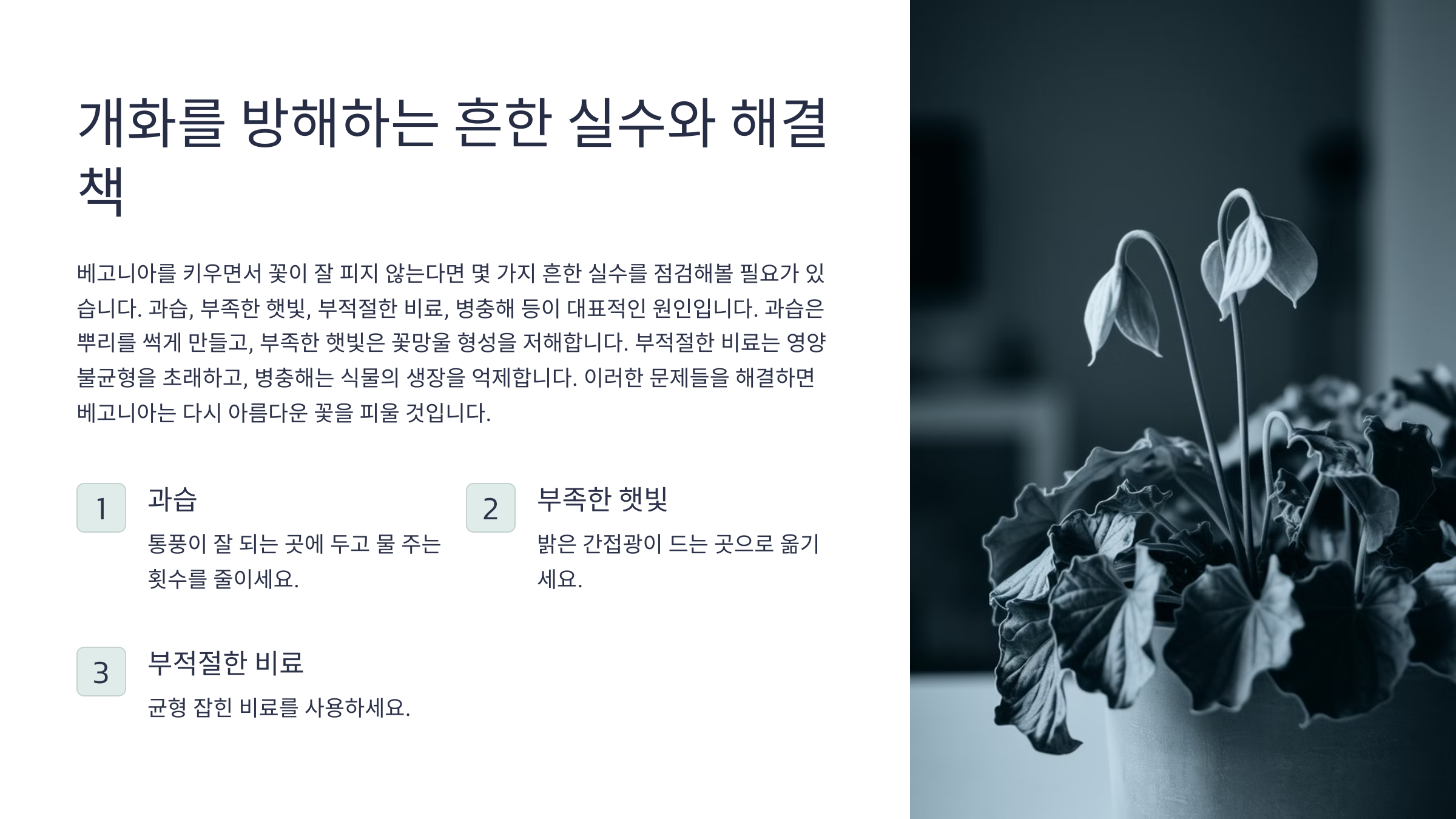 베고니아를 키우면서 실수하기 쉬운 부분들이 있어요. 아무리 정성 들여 키워도 몇 가지 실수를 하면 꽃이 피지 않거나 건강이 나빠질 수 있답니다. 🌱