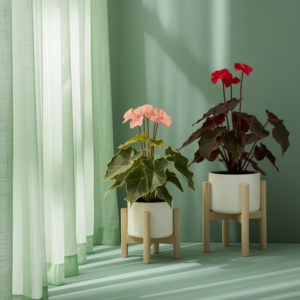 베고니아는 밝은 간접광을 좋아하지만, 직사광선을 받으면 잎이 타버릴 수 있어요. 창가 커튼 뒤쪽이나 반그늘에서 키우는 게 좋아요.