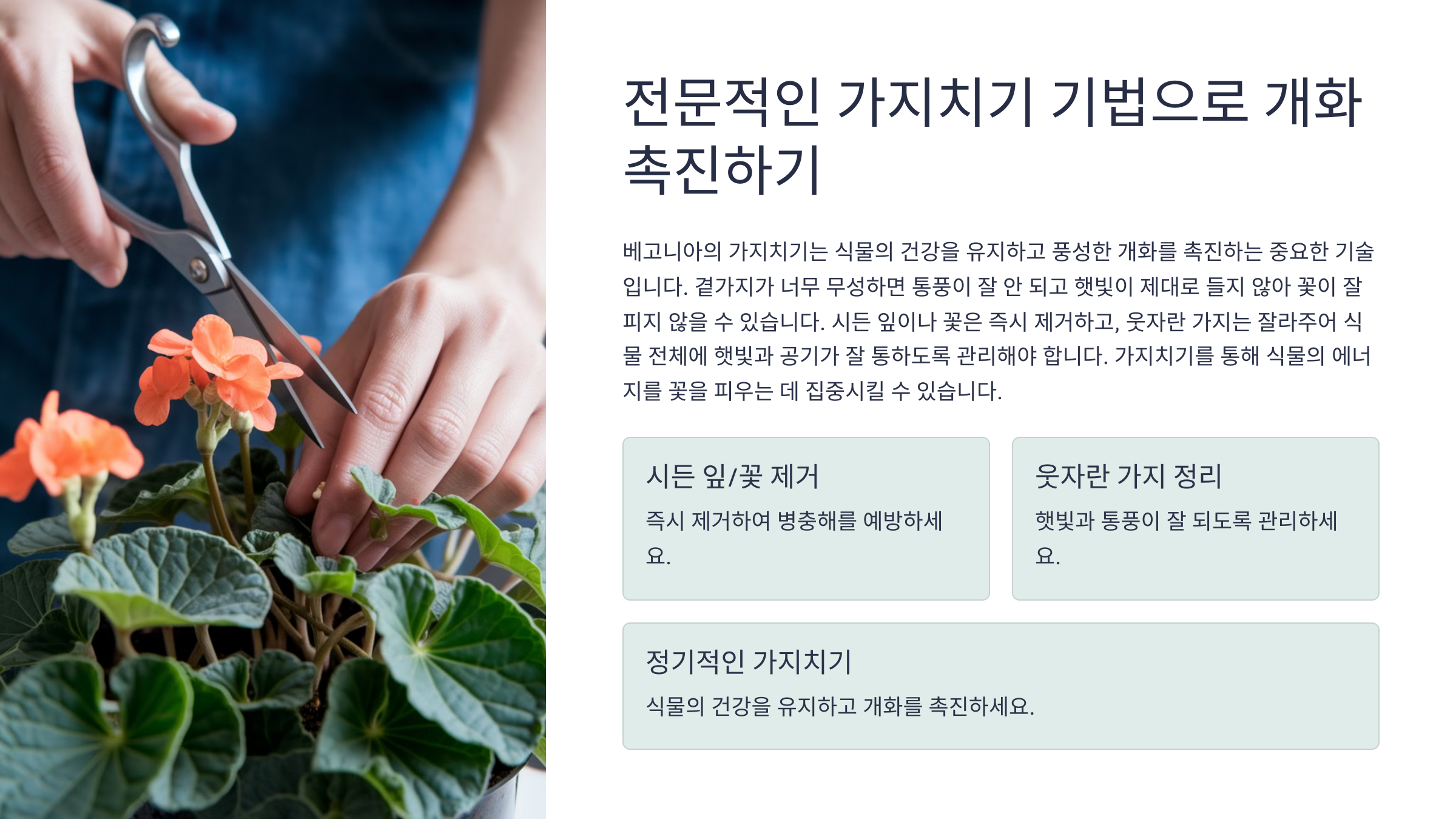 베고니아는 가지치기를 통해 더 풍성하게 자라고, 꽃도 많이 피울 수 있어요. 적절한 가지치기를 하지 않으면 식물이 웃자라거나 잎만 무성해질 수도 있어요. ✂️