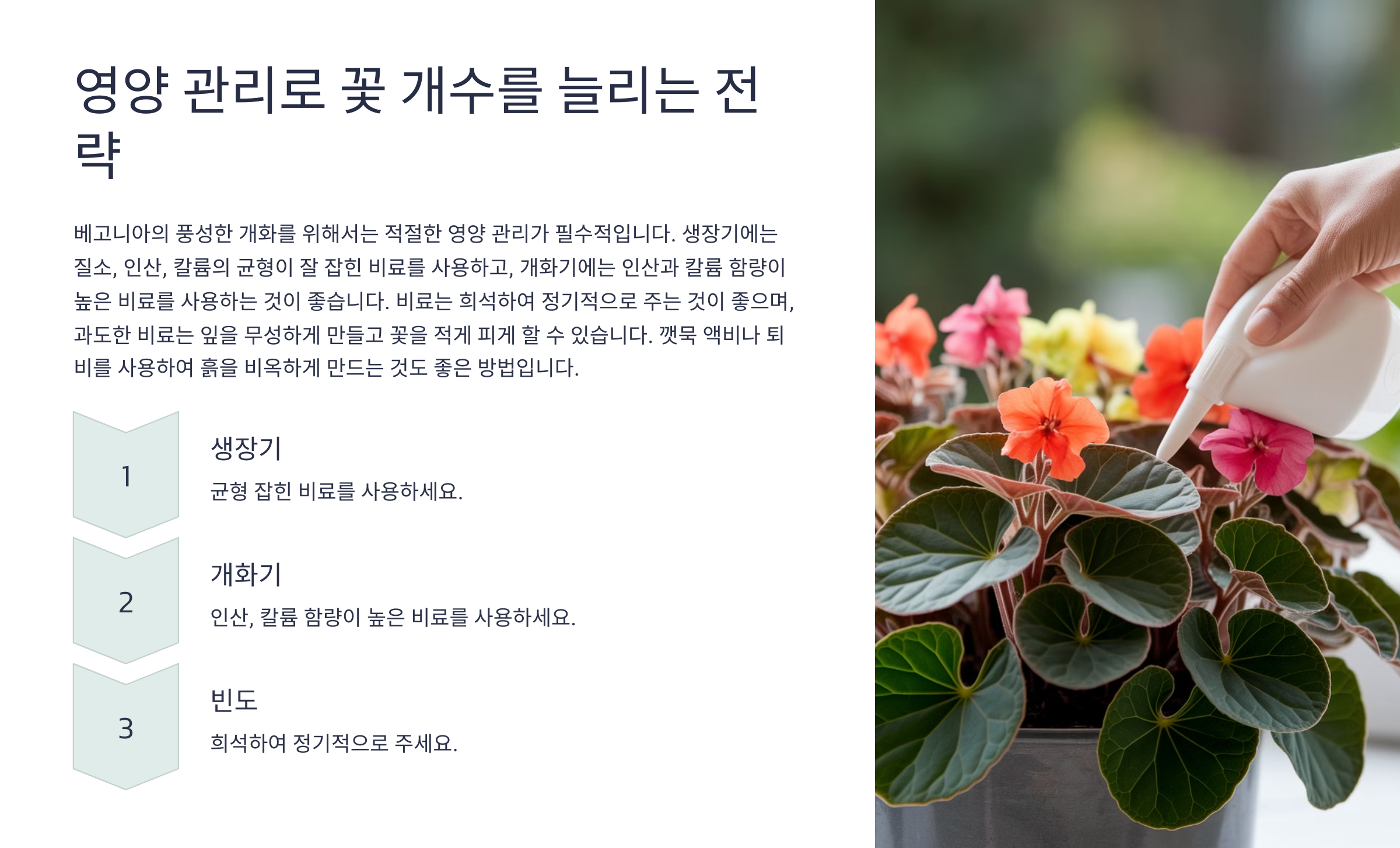 베고니아가 건강하고 풍성한 꽃을 피우려면 적절한 영양 공급이 필수예요. 영양이 부족하면 꽃이 작게 피거나 금방 떨어질 수 있거든요. 🌼