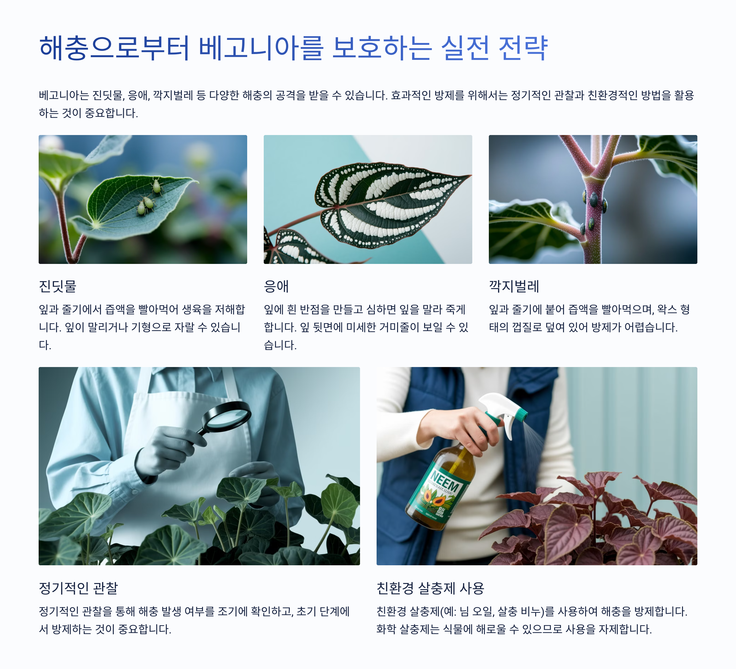 베고니아는 해충 피해를 쉽게 받을 수 있어요. 특히 베란다나 야외에서 키우면 진딧물, 응애, 깍지벌레 같은 해충들이 자주 발생하죠. 😨