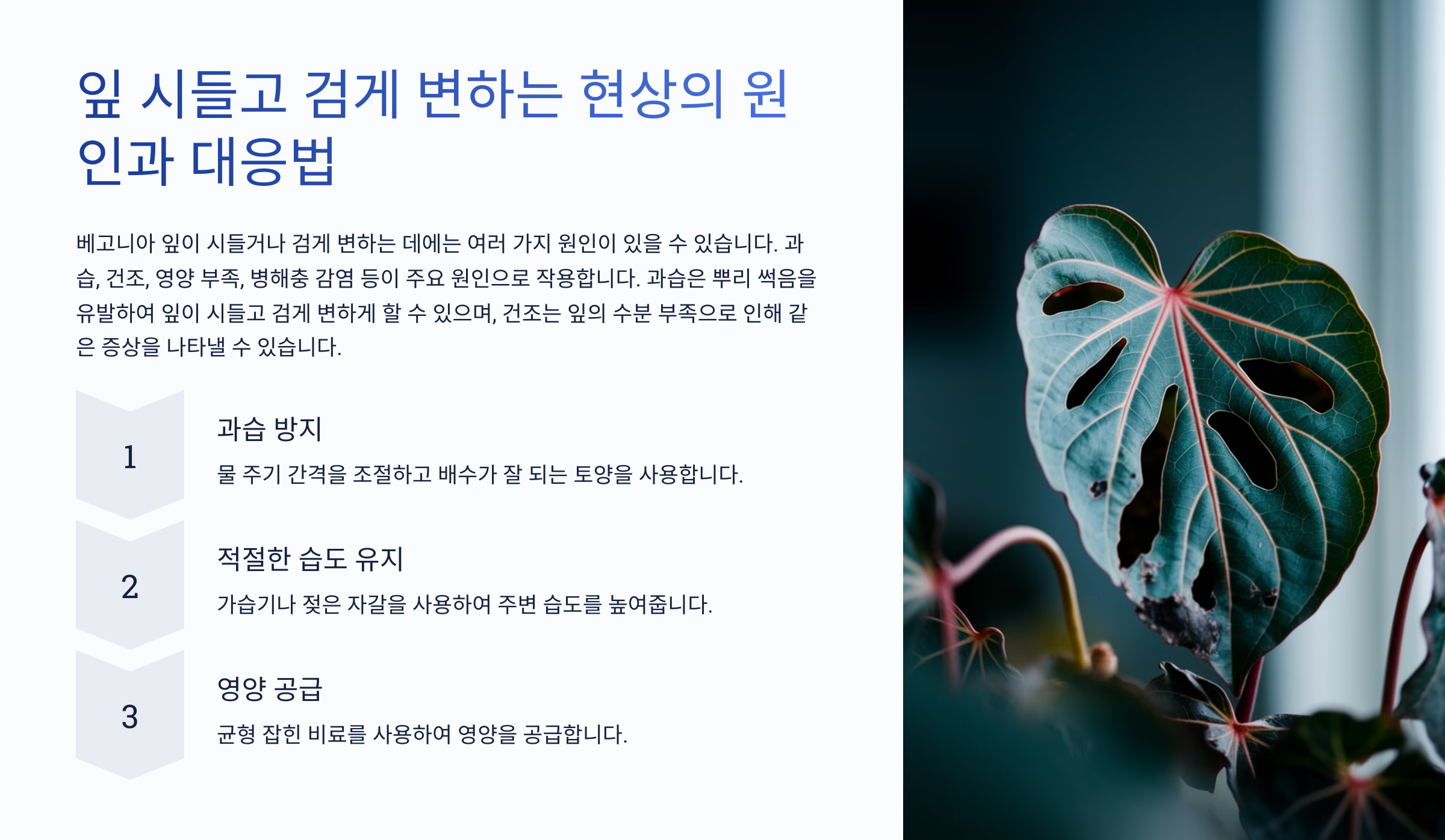 베고니아 잎이 건강하지 않다면 무언가 문제가 생긴 거예요. 😟 잎이 시들거나 검게 변하는 이유는 여러 가지가 있는데, 그 원인을 정확히 파악해야 해결할 수 있어요!