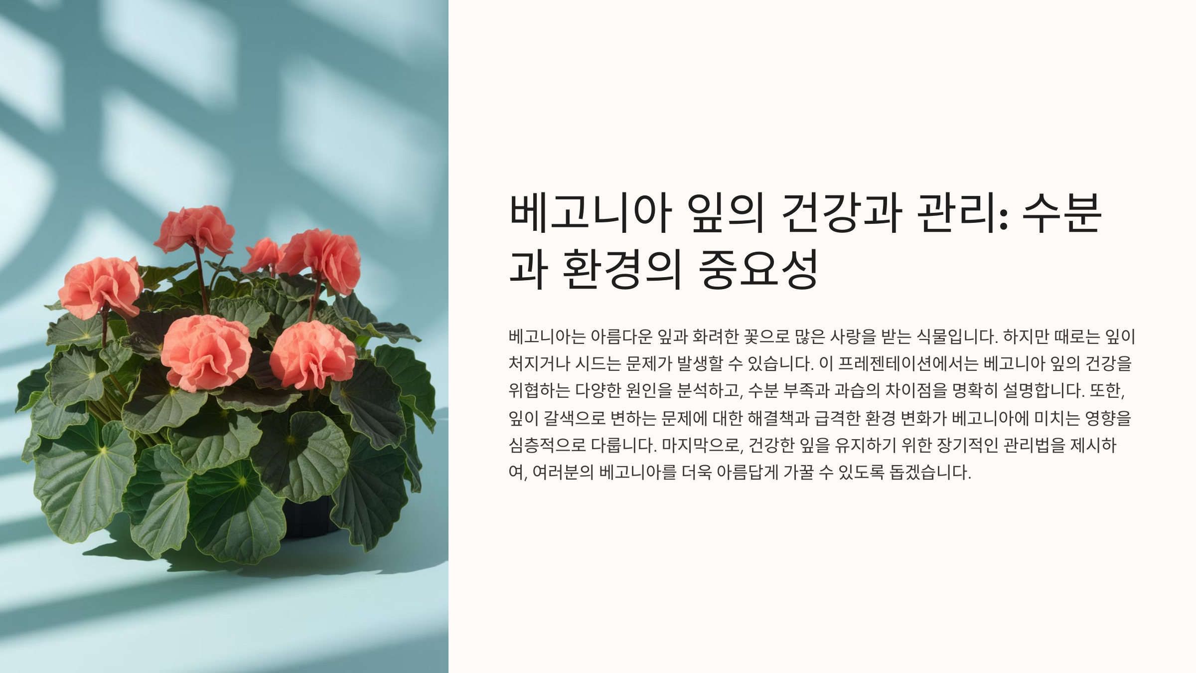 내가 생각했을 때, 베고니아는 변화를 천천히 주는 것이 가장 중요해요! 갑자기 환경이 바뀌면 적응하지 못하고 잎이 떨어질 수 있어요. 🌱