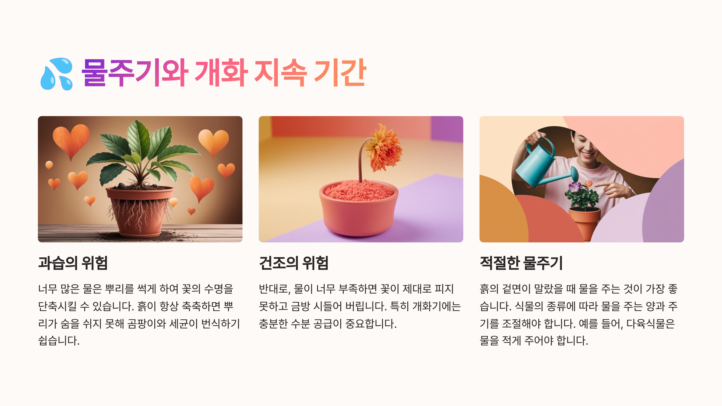 꽃을 오래 지속하려면 이 원인들을 해결해 주는 것이 중요해요! 다음으로는 물주기가 개화 지속 기간에 미치는 영향을 알아볼게요. 💦