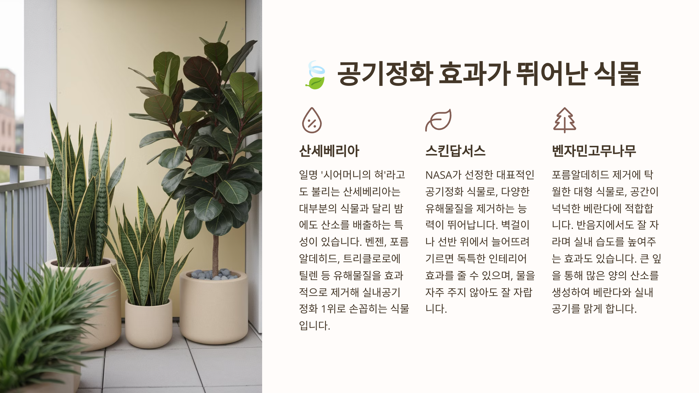베란다는 집 안과 바깥을 연결하는 공간이기 때문에 미세먼지나 외부 오염물질이 쉽게 유입될 수 있어요. 이럴 때 공기정화 식물을 키우면 실내 공기를 깨끗하게 유지할 수 있어요! 🌿