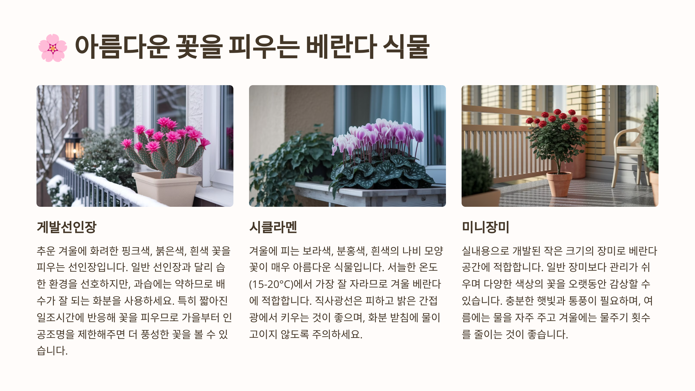 이제 초보자도 부담 없이 베란다 정원을 꾸밀 수 있겠죠? 😃 다음은 예쁜 꽃이 피는 베란다 식물들을 알아볼까요? 🌸