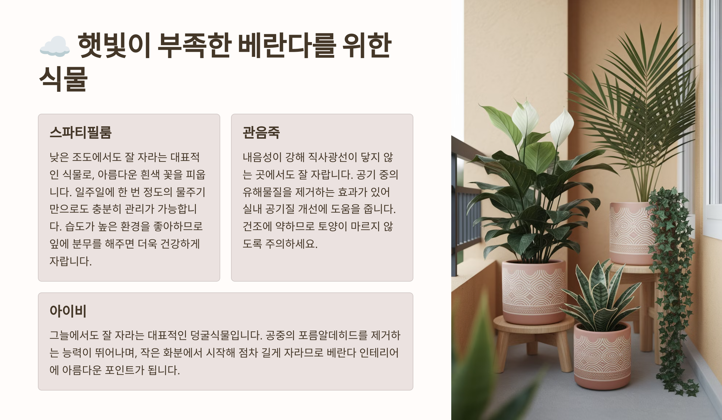 베란다 정원을 꾸미는 첫 걸음, 식물 선택이 끝났다면 이제 햇빛이 부족한 환경에서도 잘 자라는 식물들을 살펴볼까요? ☁️