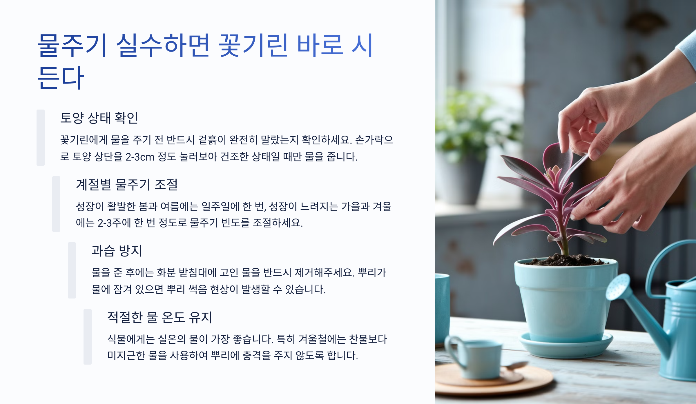 꽃기린은 건조한 환경을 좋아하는 다육식물이에요. 따라서 물을 너무 자주 주면 뿌리가 썩을 위험이 커요. 일반적으로 봄·여름철에는 1주일에 한 번, 가을·겨울철에는 2~3주에 한 번 정도 물을 주는 것이 적당해요. 🌱