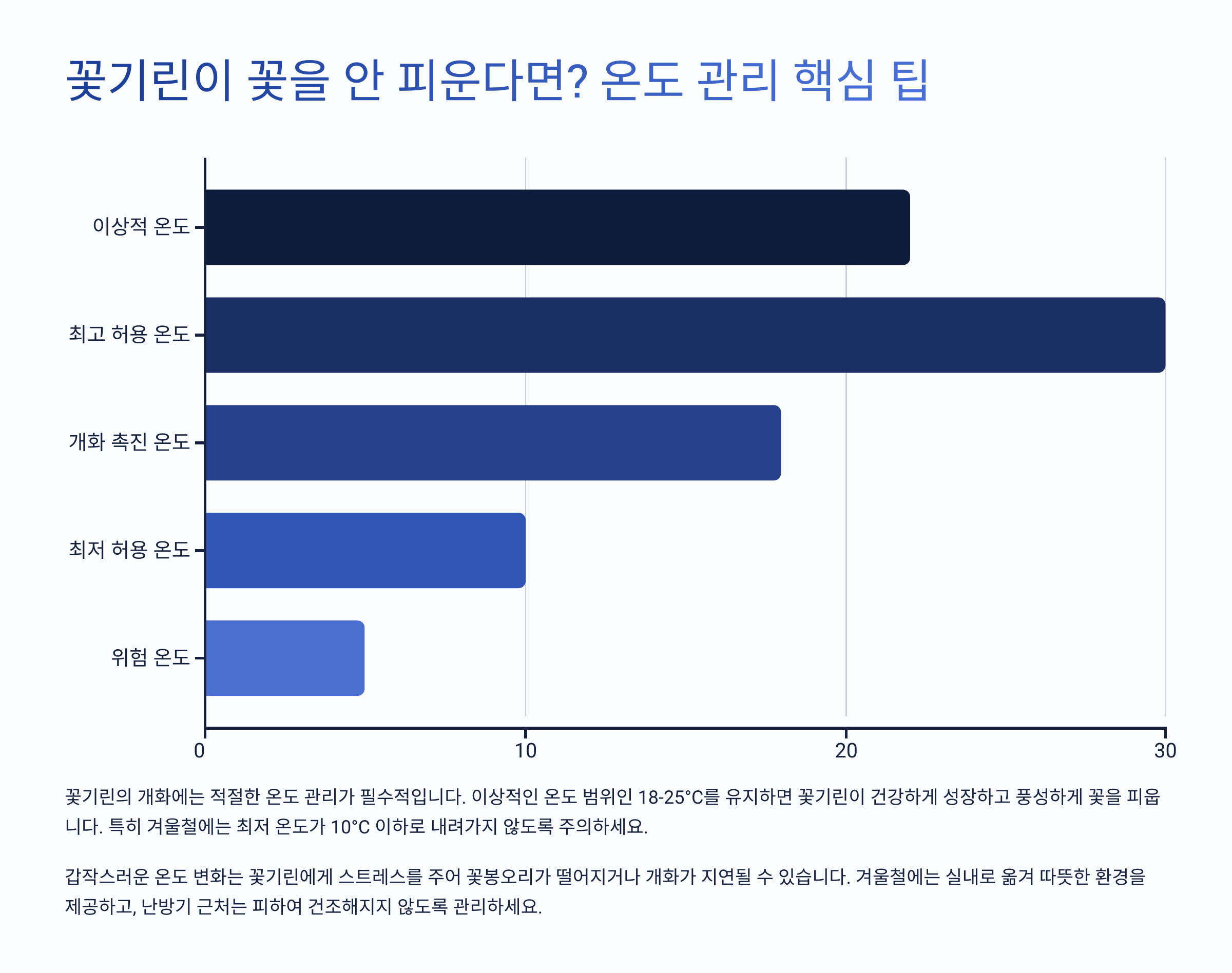 꽃기린이 꽃을 피우려면 적절한 온도를 유지하는 것이 중요해요. 최적의 생육 온도는 **18~25℃**로, 너무 춥거나 덥지 않은 환경이 좋아요. 기온이 10℃ 이하로 떨어지면 성장이 멈추고, 5℃ 이하에서는 냉해를 입을 수 있어요. ❄️