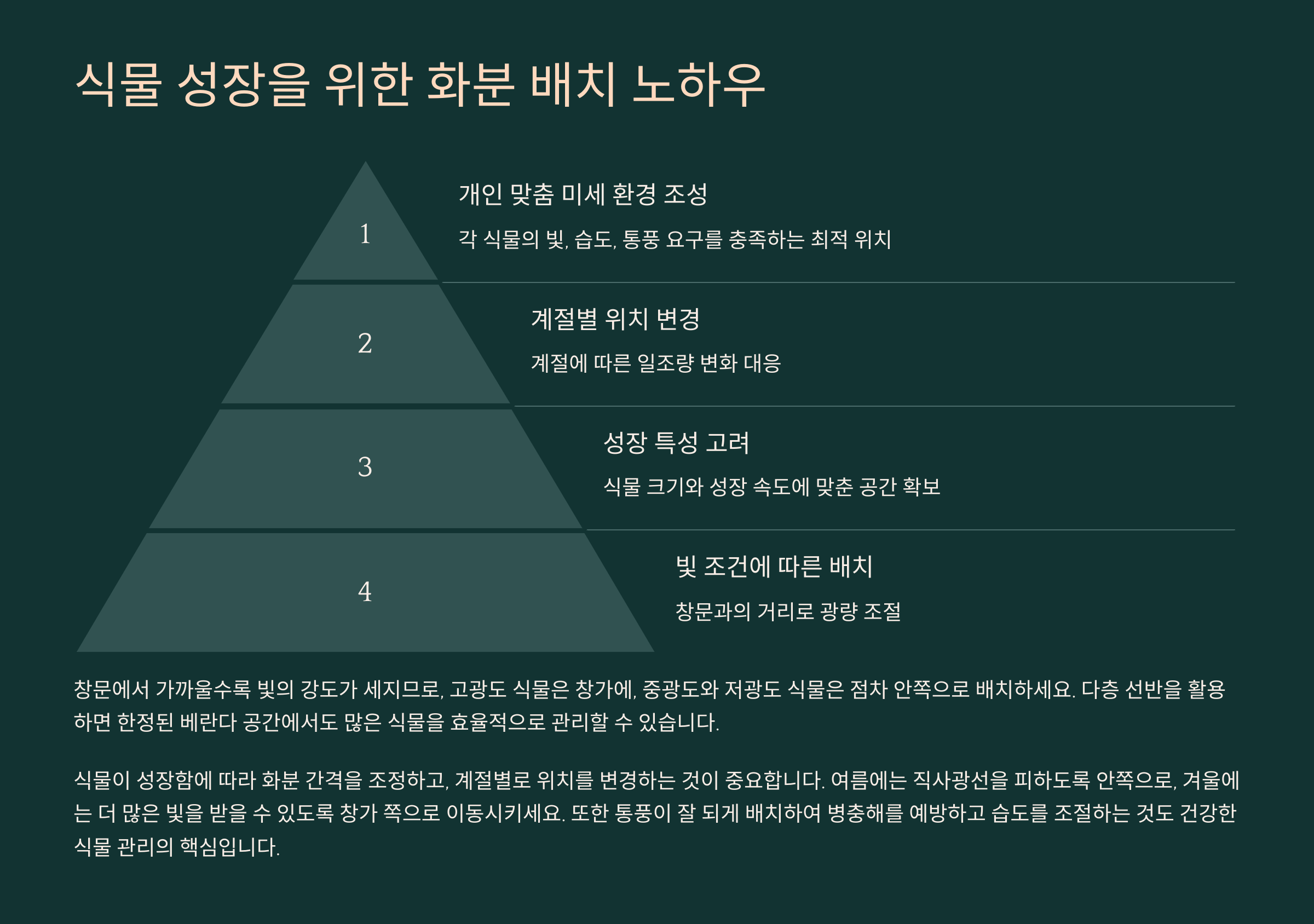 ✅ **반그늘을 선호하는 식물**은 화분 선반 중간 또는 실내 가까운 곳에 배치