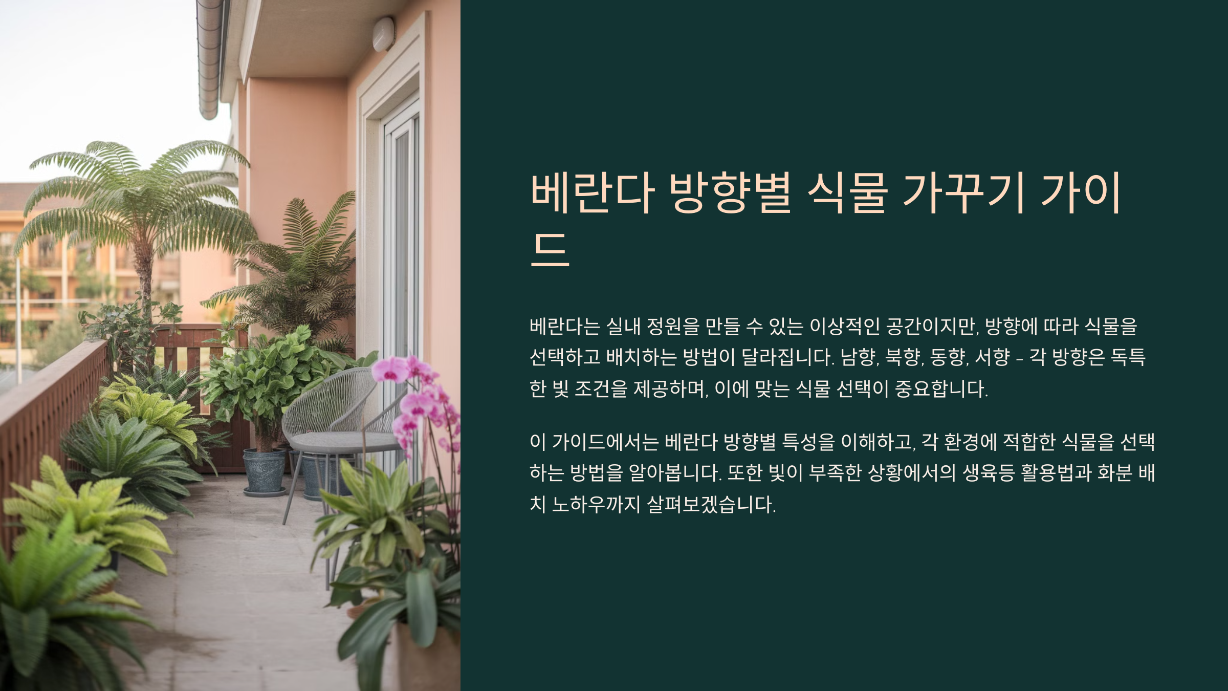 베란다의 방향에 따라 햇빛의 양과 강도가 달라지기 때문에, 그에 맞는 식물을 선택하는 것이 중요해요! 🌱