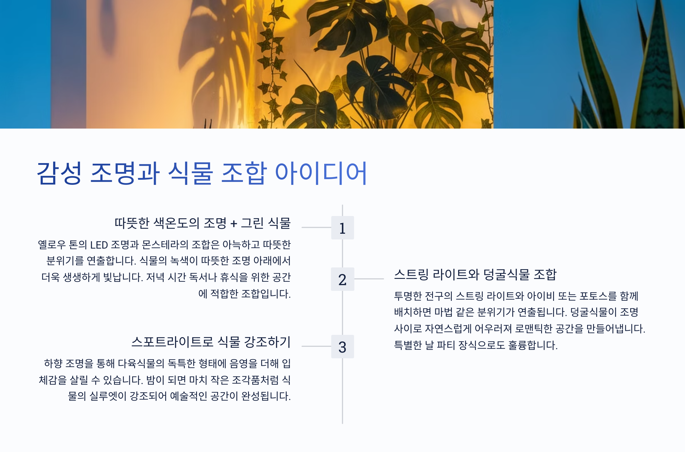 아래는 **감성 조명과 식물을 조합하는 5가지 아이디어**예요! 💡