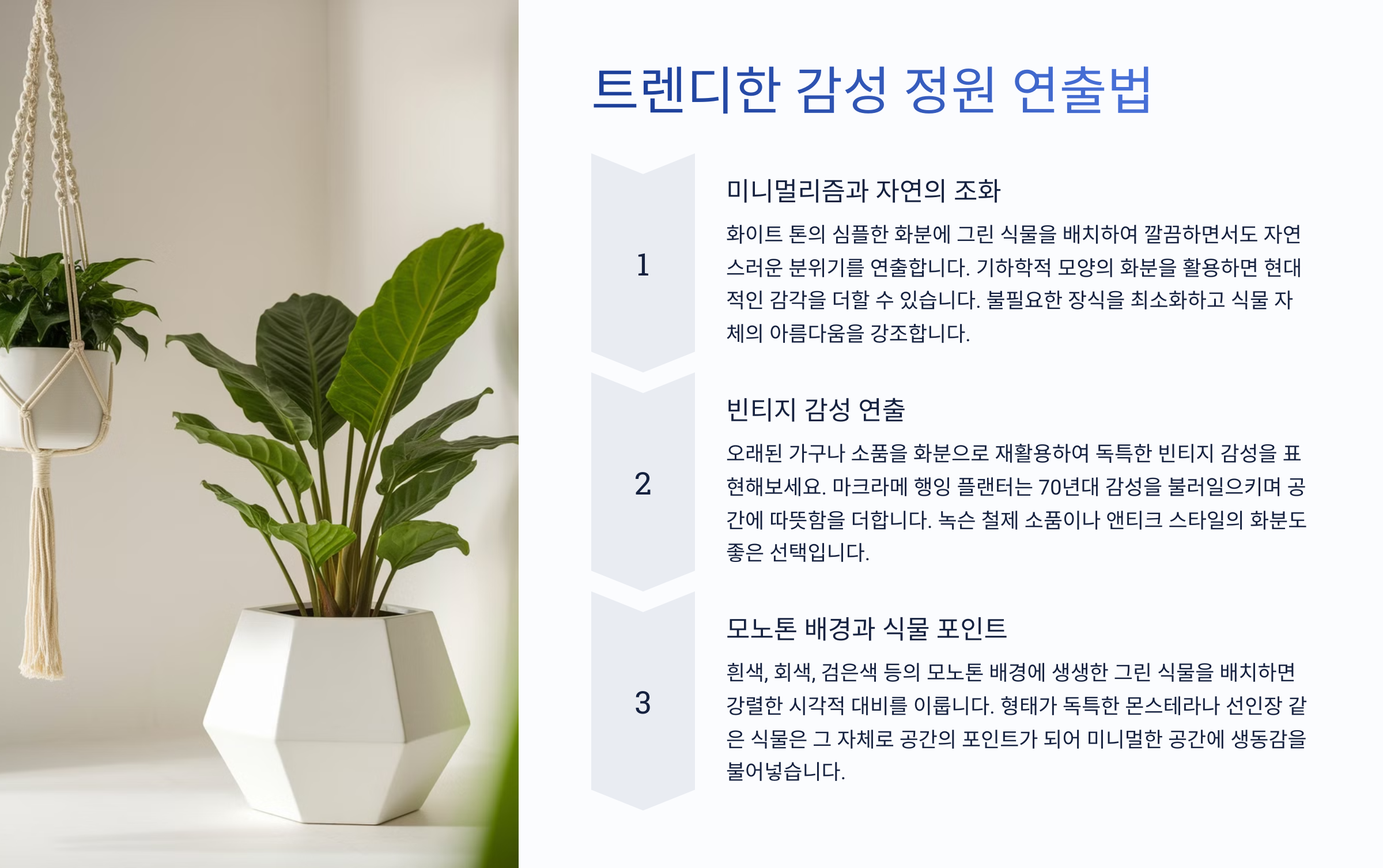 | 💡 빈티지 무드 | 앤틱한 화분과 감성 조명을 함께 배치 |