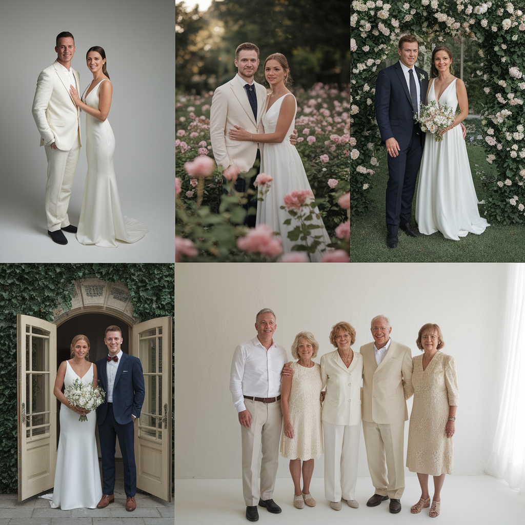 | 클래식 웨딩 | 고급스러운 정장과 드레스 스타일 | 실내 스튜디오, 고풍스러운 호텔 |