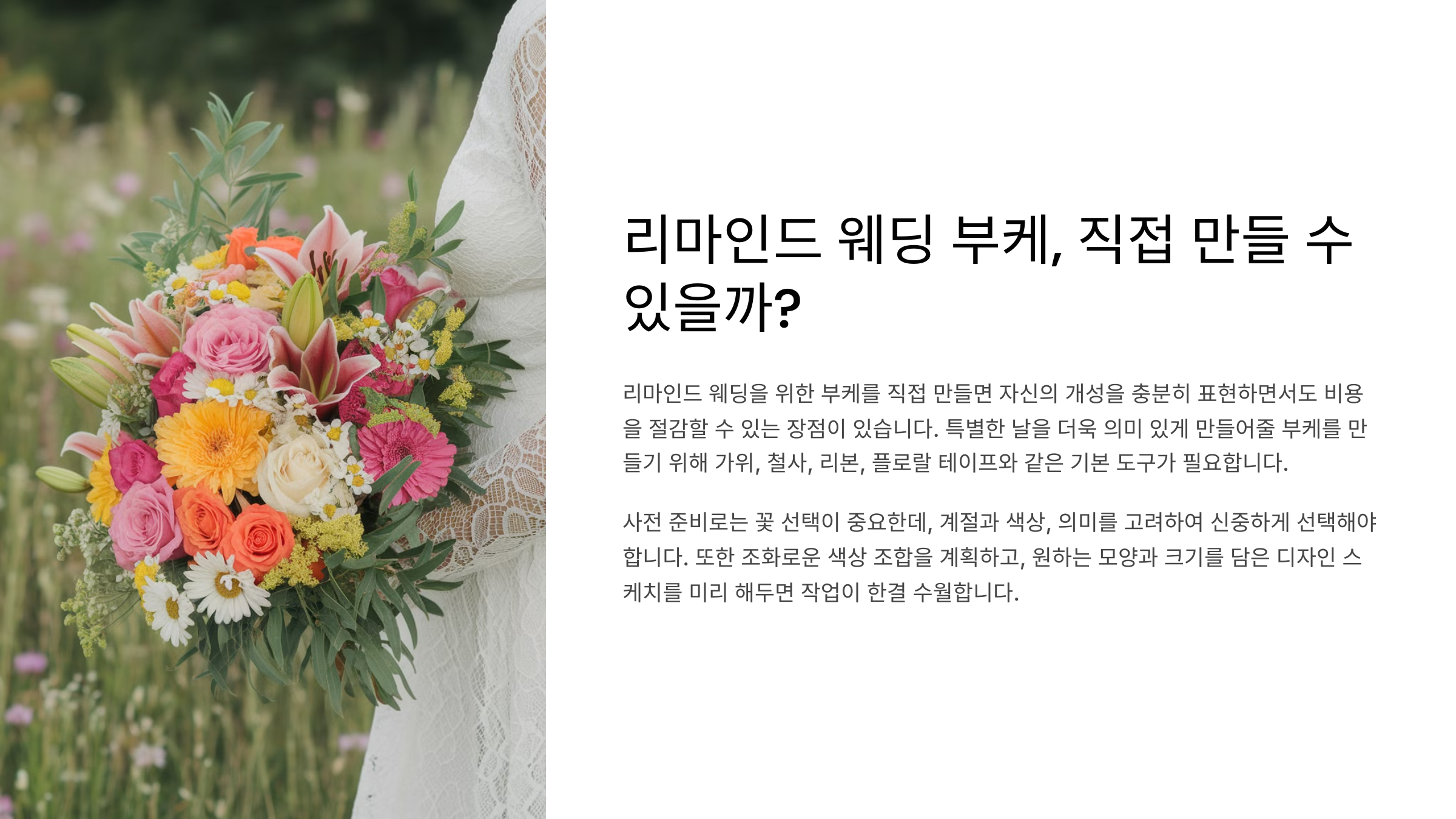 하지만 부케를 직접 만드는 게 가능할까요? 어떤 꽃을 선택해야 하고, 어떻게 디자인해야 할까요? 오늘은 리마인드 웨딩 부케를 직접 준비하는 방법과 함께 보관 꿀팁까지 모두 알려드릴게요! 🎀